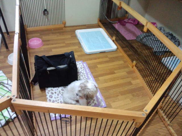 鳴きも騒ぎもせずに大人しくサークルの中に居ます。他のワンコ達にも興味はないかな?