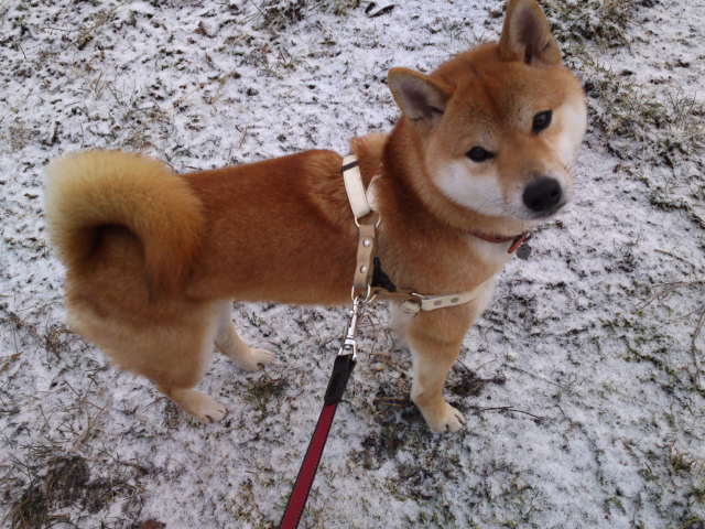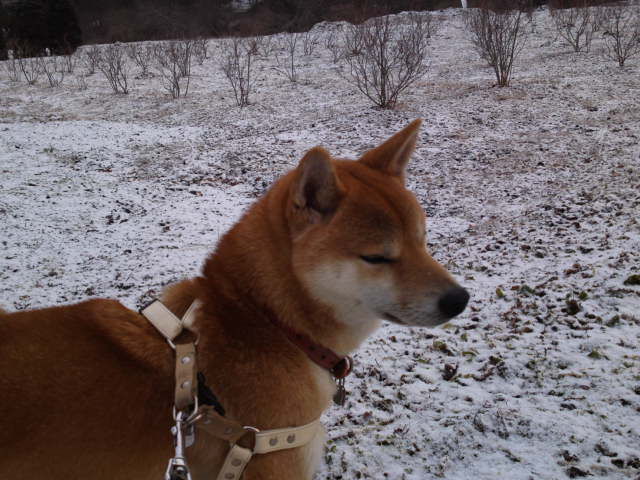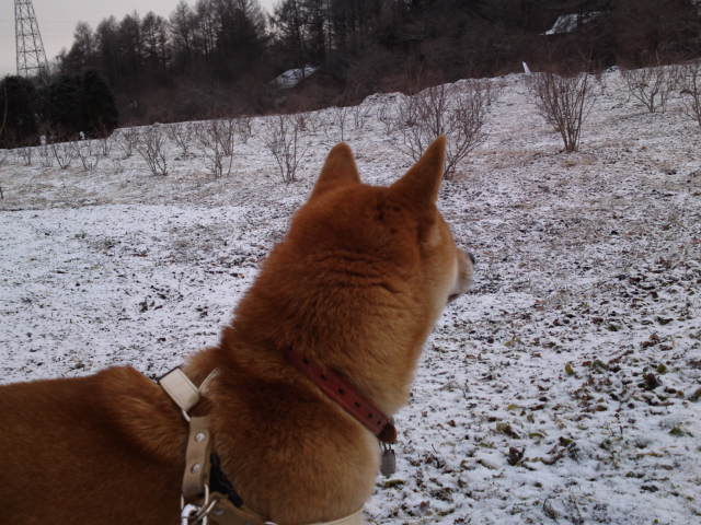 今朝はうっすらと雪が積もっています。ハチ君、お散歩仲間を待っているのか遠くを見つめていました。