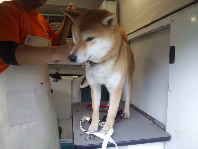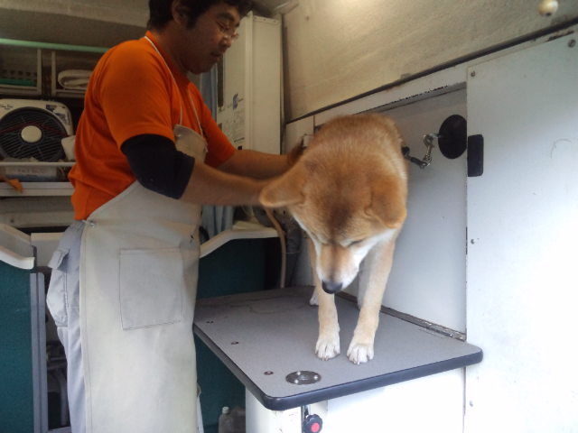 柴ハチ君は今日はシャンプーの日です。 お馴染みの移動シャンプー屋のクープーさんに来て貰ってます。