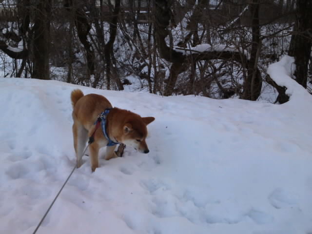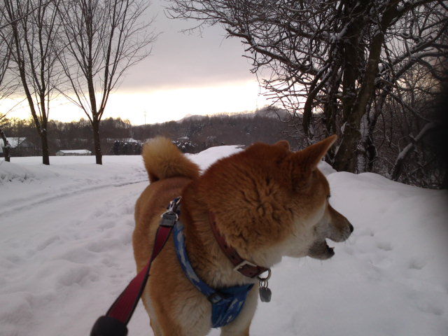 夕方になり冷え込んできました。ハチ君、雪の上で遊ぼうと誘ってきました。