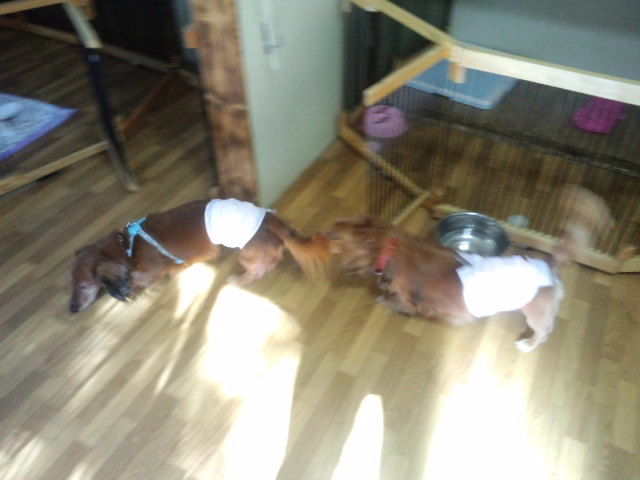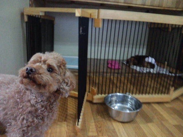 すぐにサークルから出て、ダックスチャコ君と仲良くしてます。