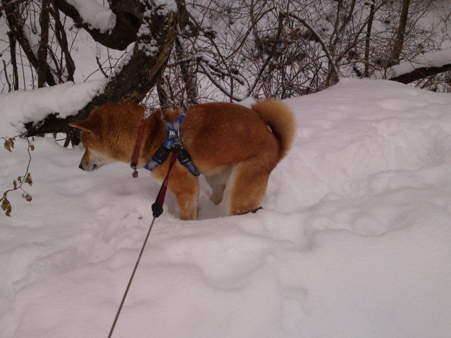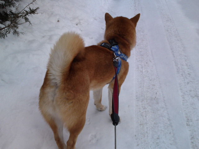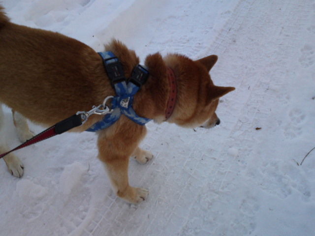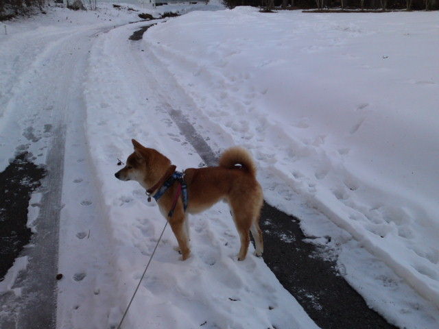 今朝は雪が降って溶けかけていた路面もまた真っ白になりました。ハチ君は再び上機嫌に雪の上を走り回っています。