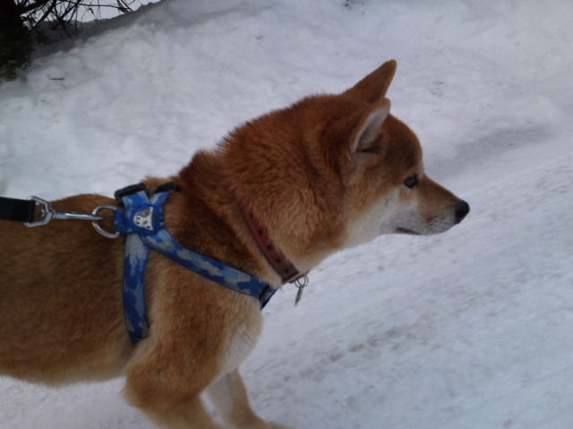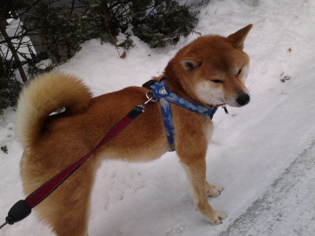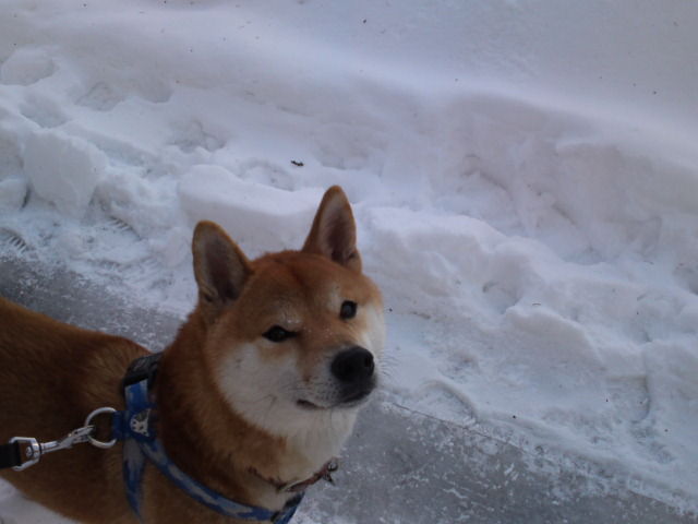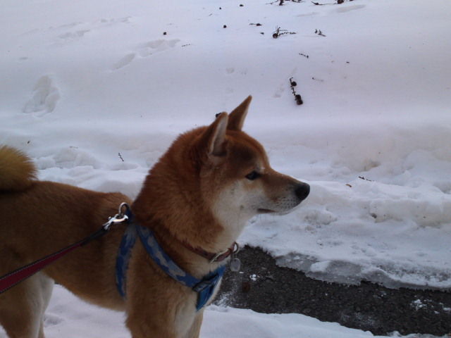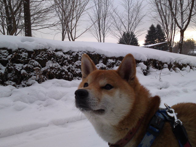 夕方には雪は止みましたがとても寒くなりました。ハチ君、鼻に雪をつけて得意げです。