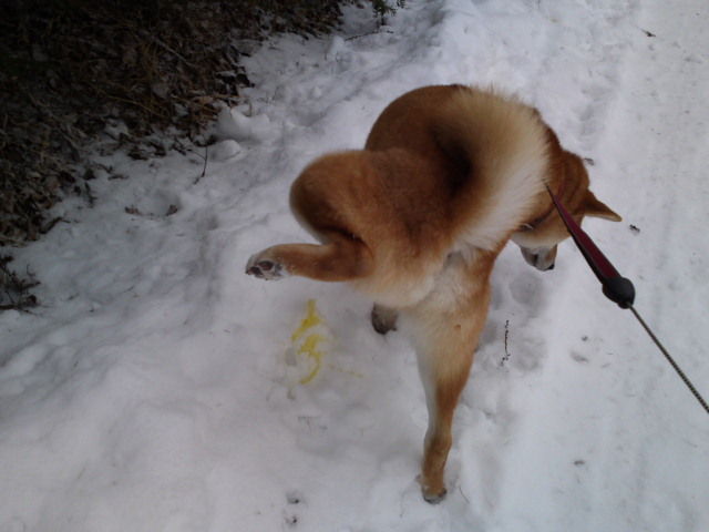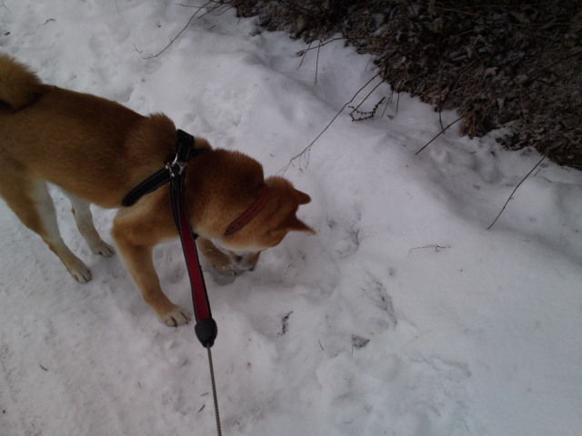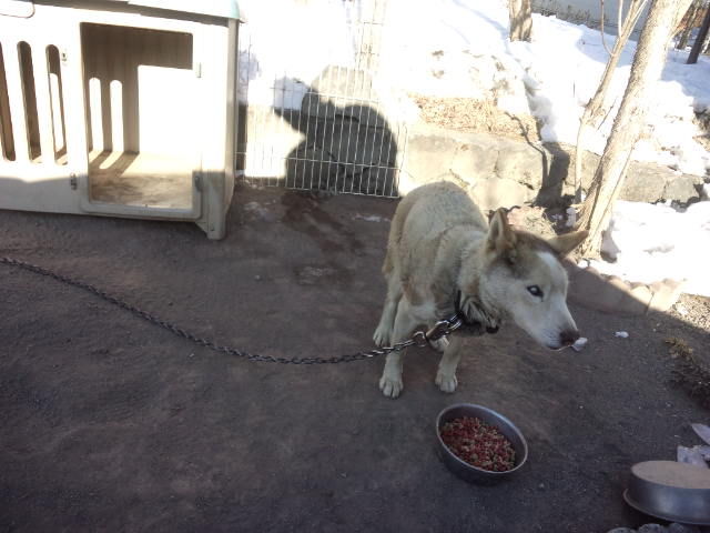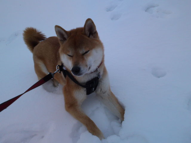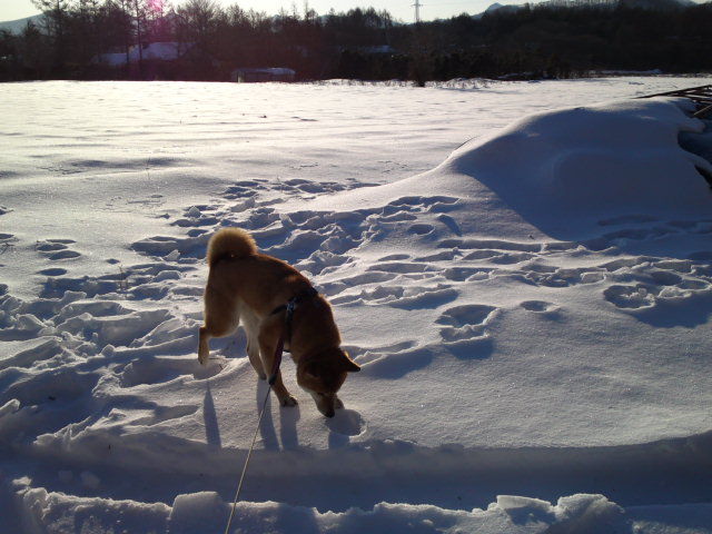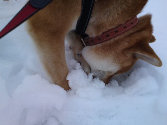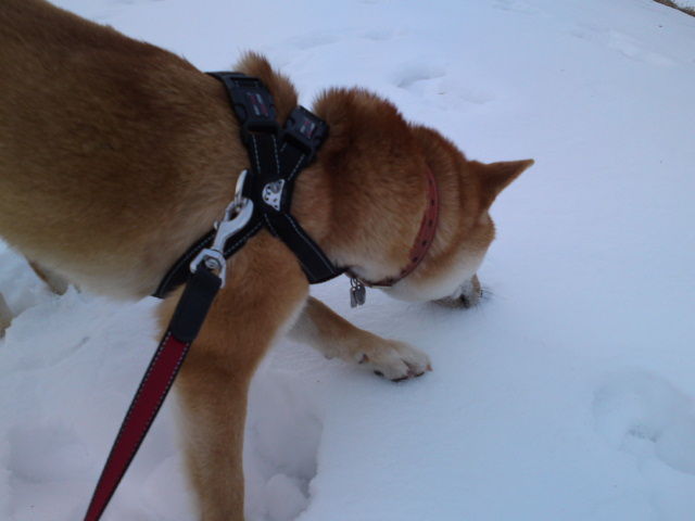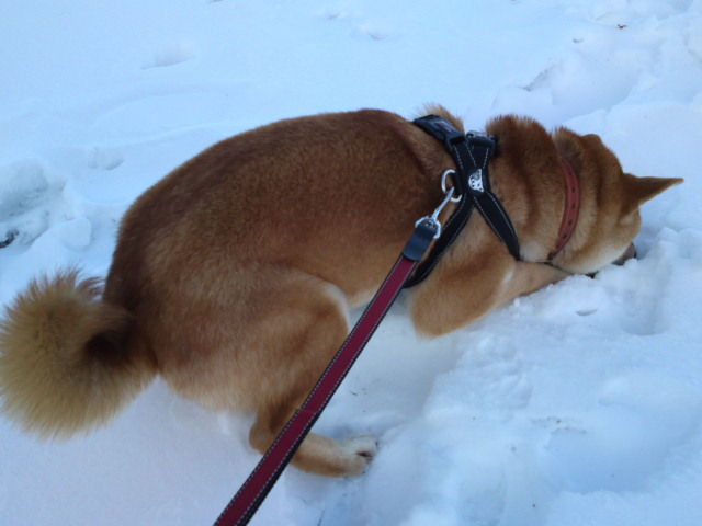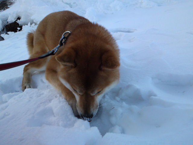 夕方になり風がとても強く寒さも一段と厳しくなりました。ハチ君、雪の中に何かを見つけたようです。楽しそうに遊んでいました。