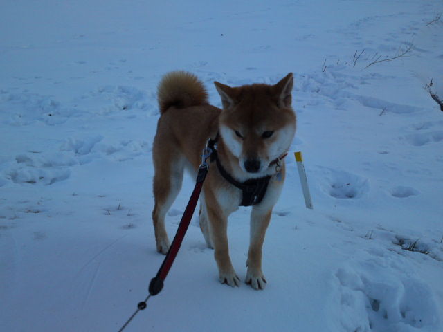 夕方のお散歩は、雪が降って風が強く吹雪のようでした。ハチ君、天気に関係なく雪の上で遊んでいました。