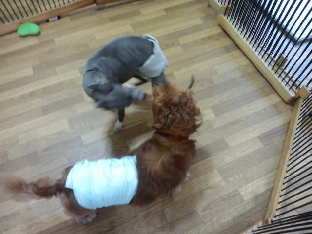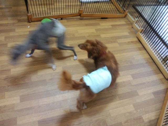 一部屋貸切の団体さん、ポメラニアンプリンちゃん・コッカーのアルフ君フィービーちゃん、ヨーキーララちゃん・フレブルホーリーちゃんがチェックインしました。