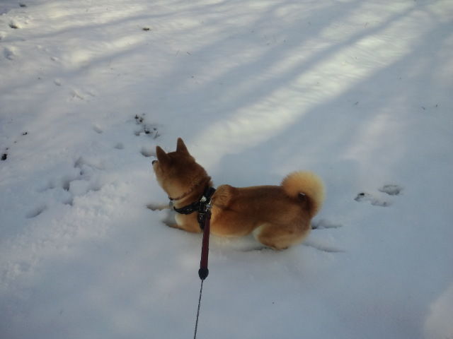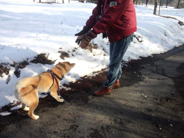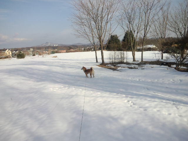 今日も雪原で遊んでいたハチ君、何かの気配を感じた様子でした。見ると上原別荘村の大家さんが散歩中、すぐに遊びかけるハチ君でした。