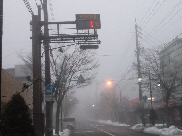 今朝の軽井沢の気温は1℃、天気は霧の軽井沢です。