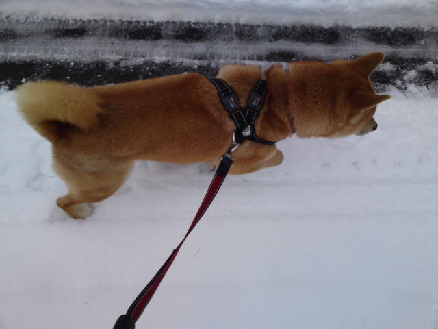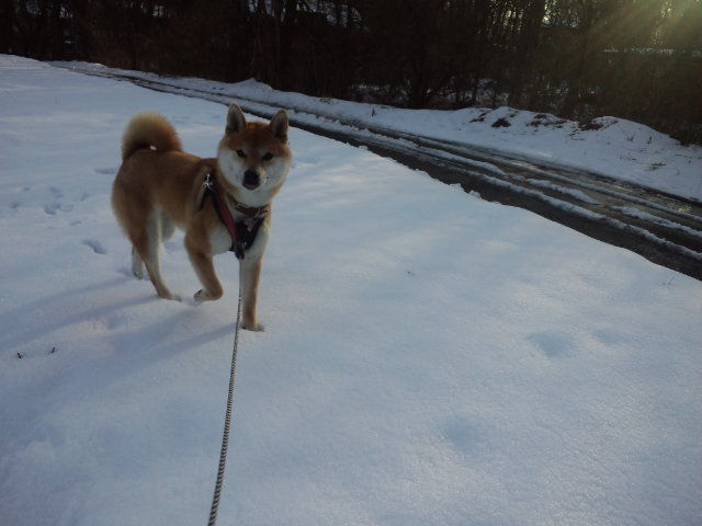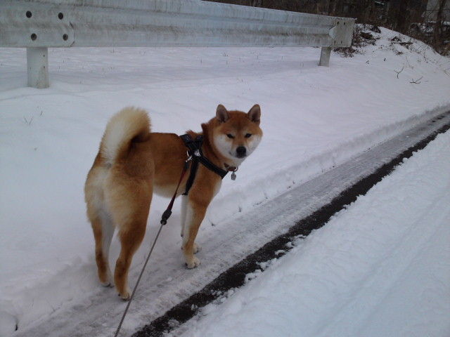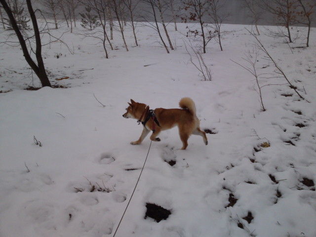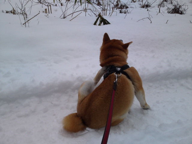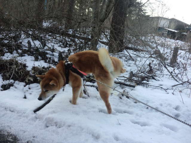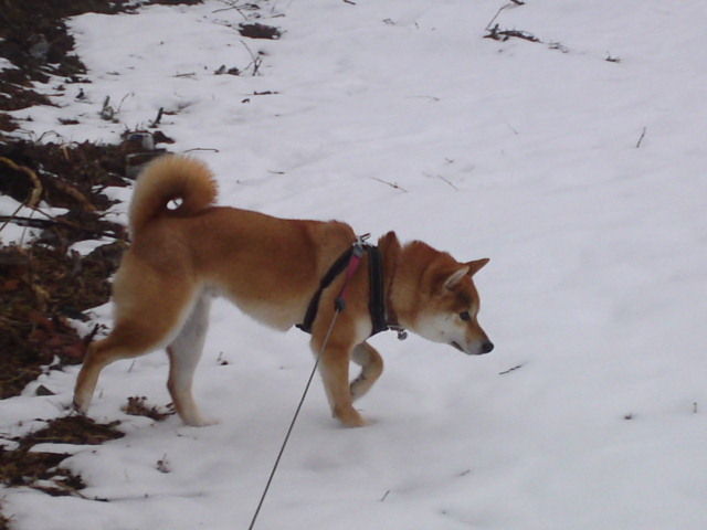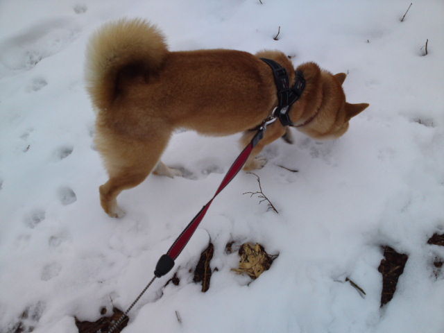 今朝は曇っていますがさほど寒さは感じられません。ハチ君、雪の中に鼻を入れて匂いを嗅いでいました。