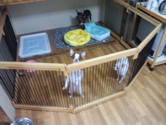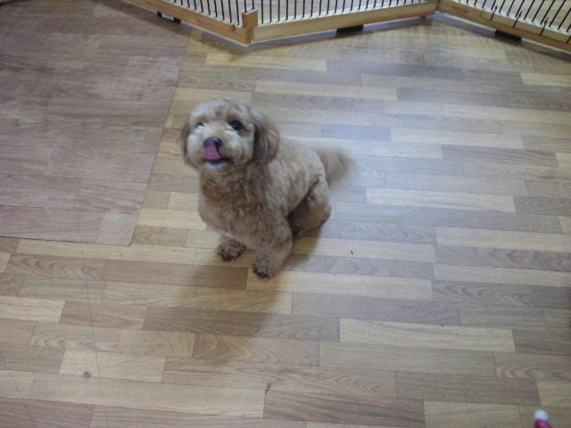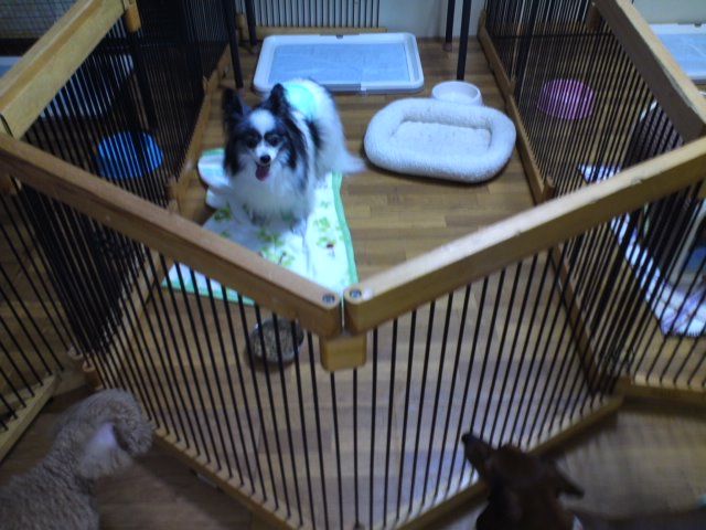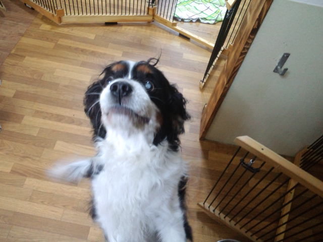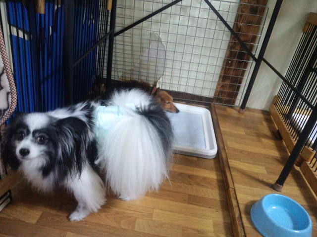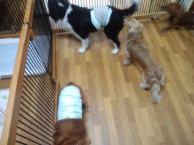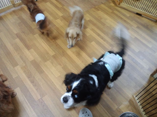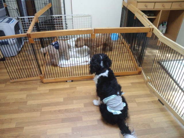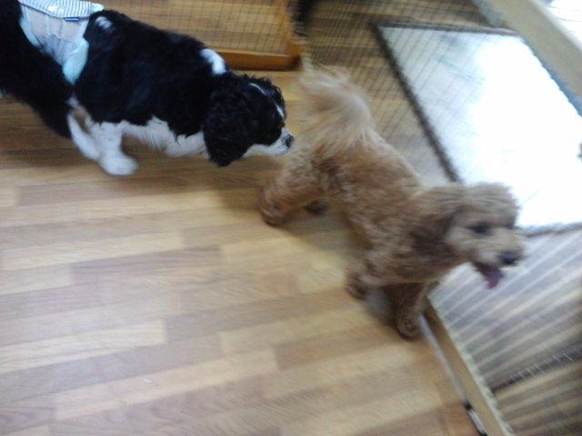 キャバリアハル君がエルモ君を気にいった様子、でもエルモ君は逃げてます。エルモ君とハル君は分けておきますね。