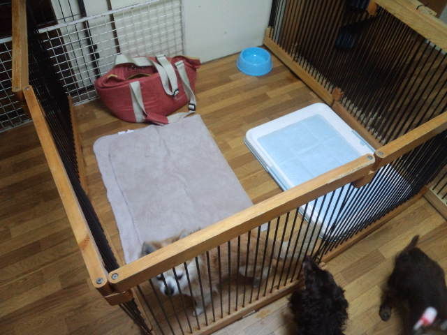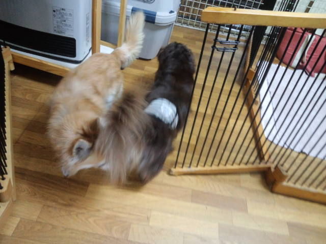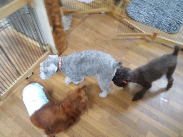 他のワンコ達とご挨拶してますが、まだぎこちない感じです。緊張気味かな?