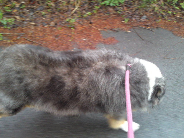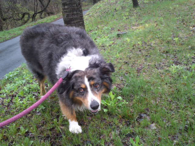 今朝は冷たい小雨が降っています。オージーシェパードのマーブル君、マーキングより一生懸命歩く事に集中していました。