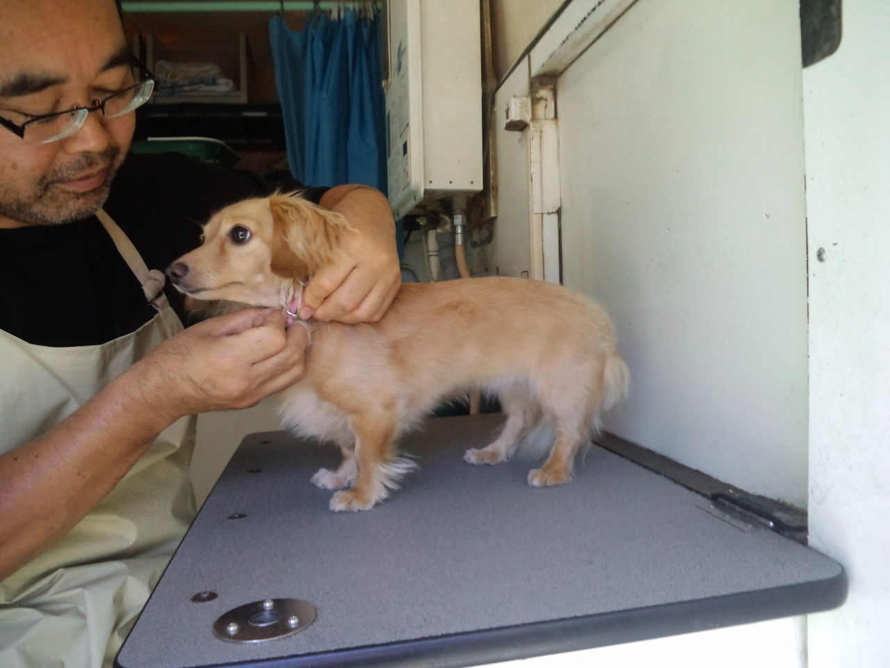 ダックスラムネちゃんはシャンプータイムです。 移動シャンプー屋のクープーさんに来て貰いました。