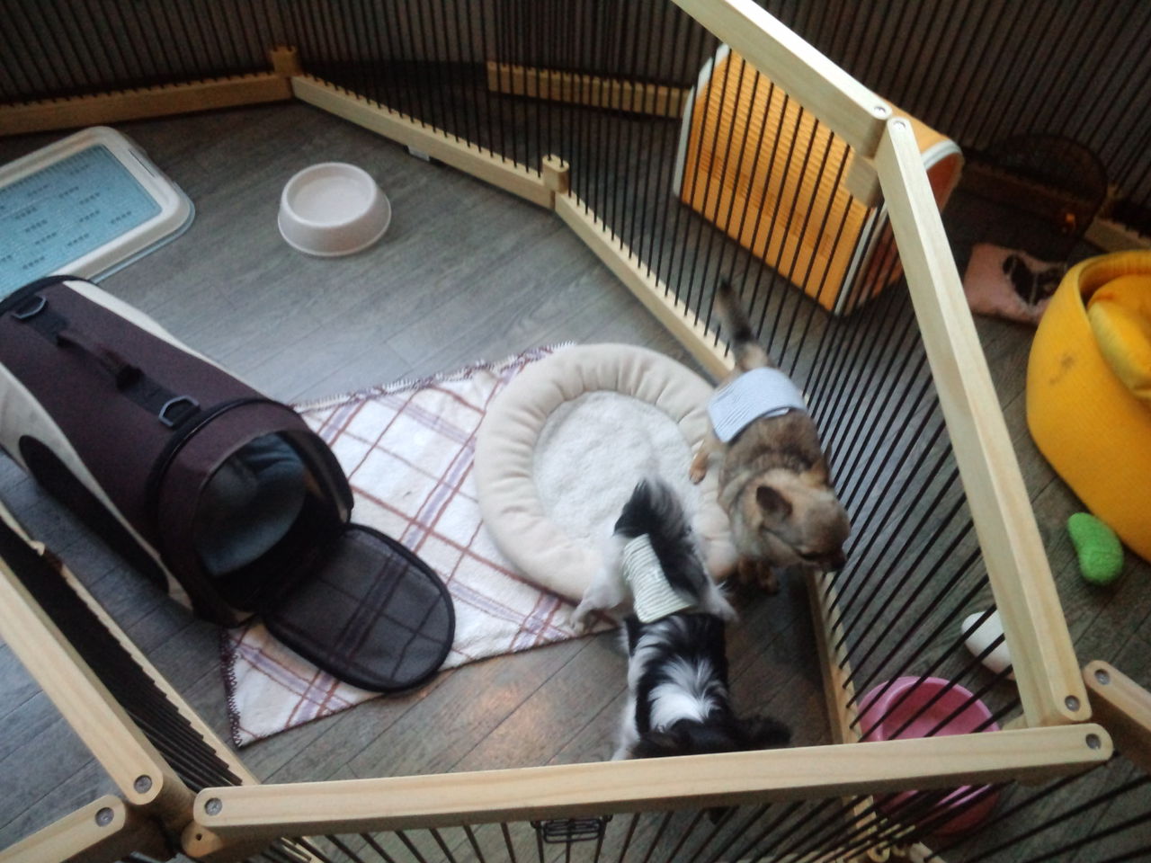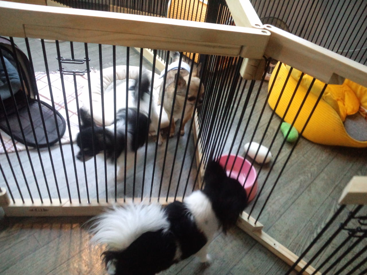 尻尾も下がってないですし、サークル越しに他のワンコに近寄れてます。しばらく様子を見て出してみますね。