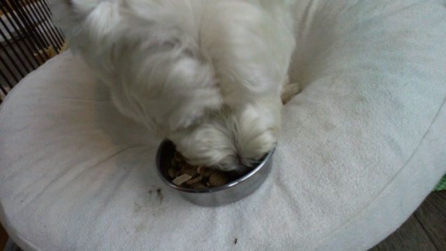 ウェスティー桃太郎君、口を付けません。甘えるのが優先みたいです。