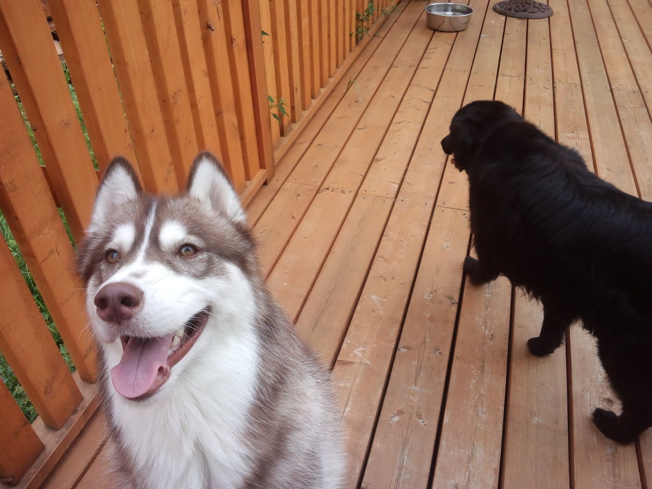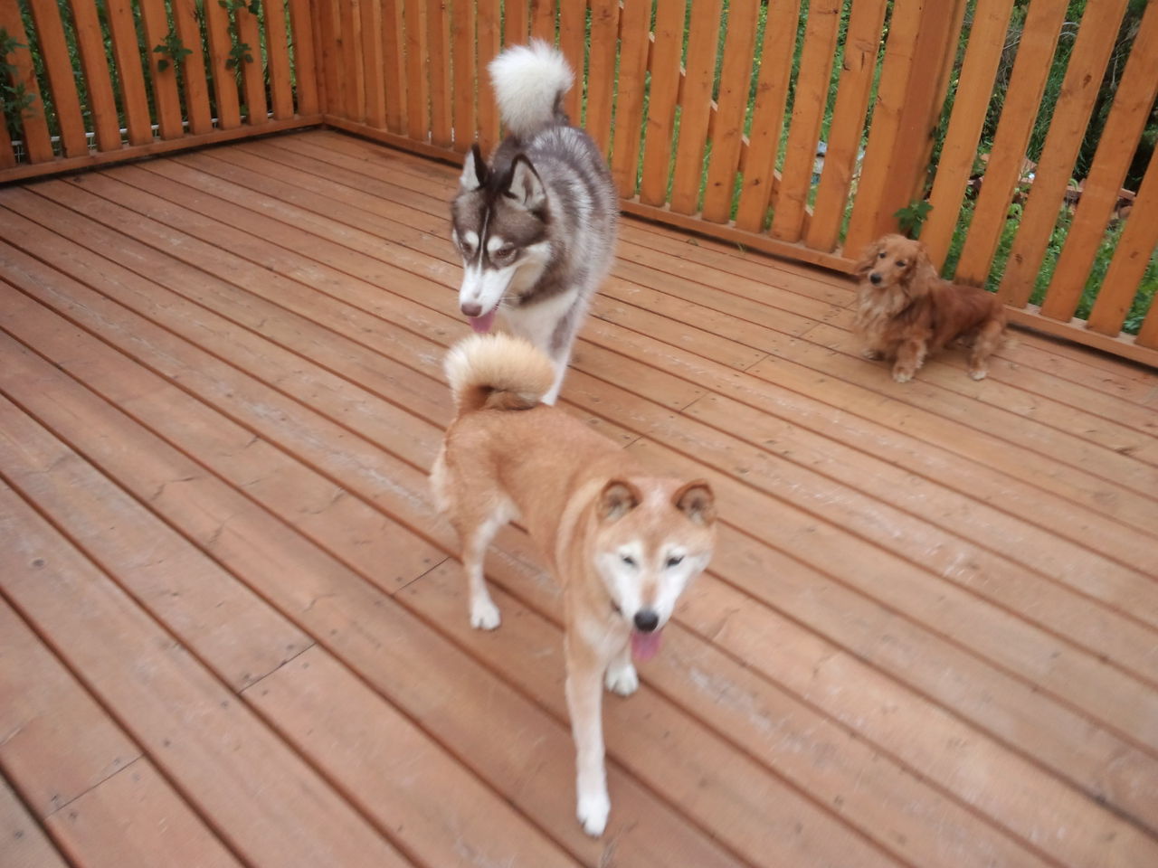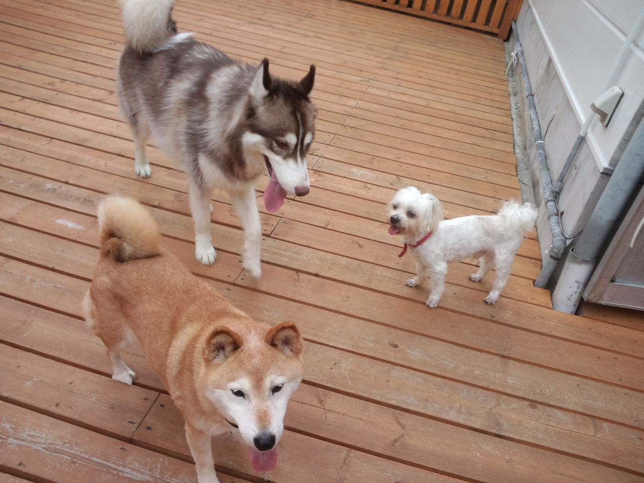 ハスキーショコラ君はすぐにデッキに出てワンコ達と遊び回ってます。