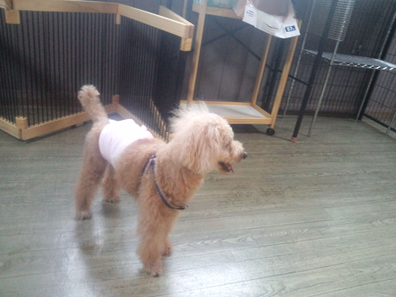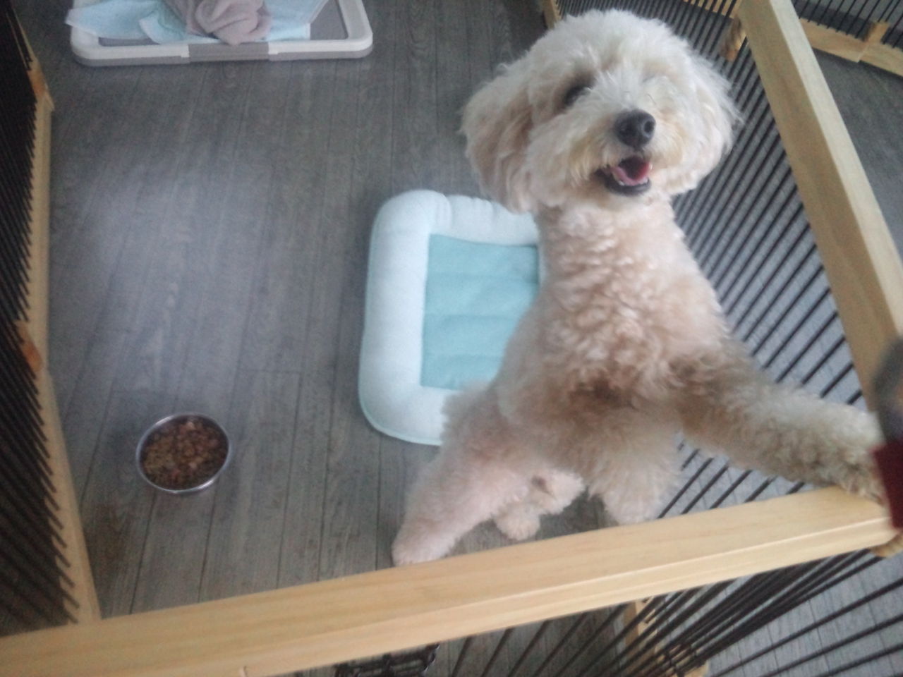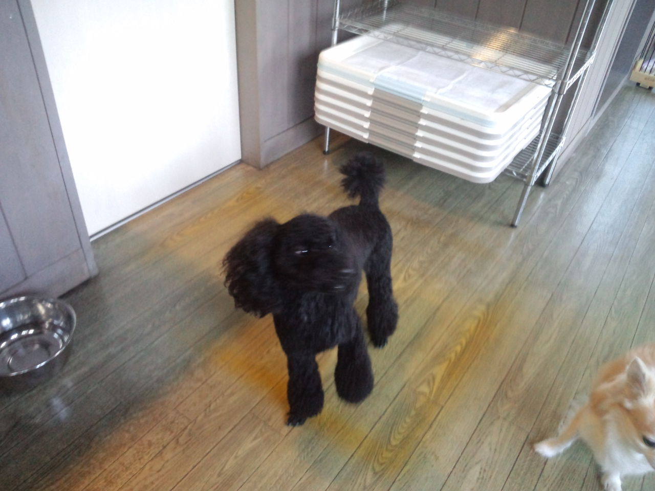 トイプーレオン君、しっかり完食しました。やはりケージに入れっぱなしは可哀想なので、店長が様子を見ながら出してます。飛び跳ねる様なら入れますね。