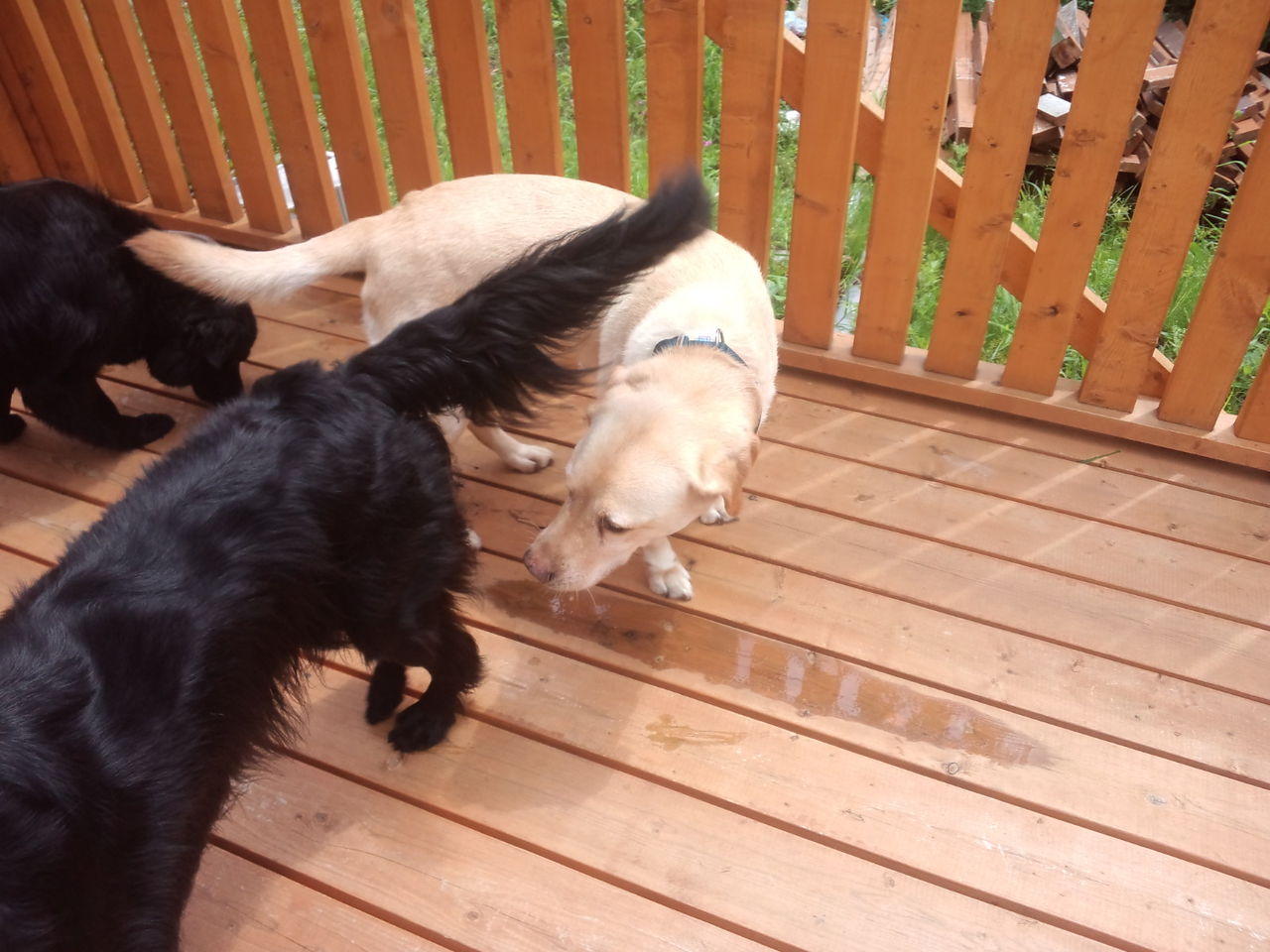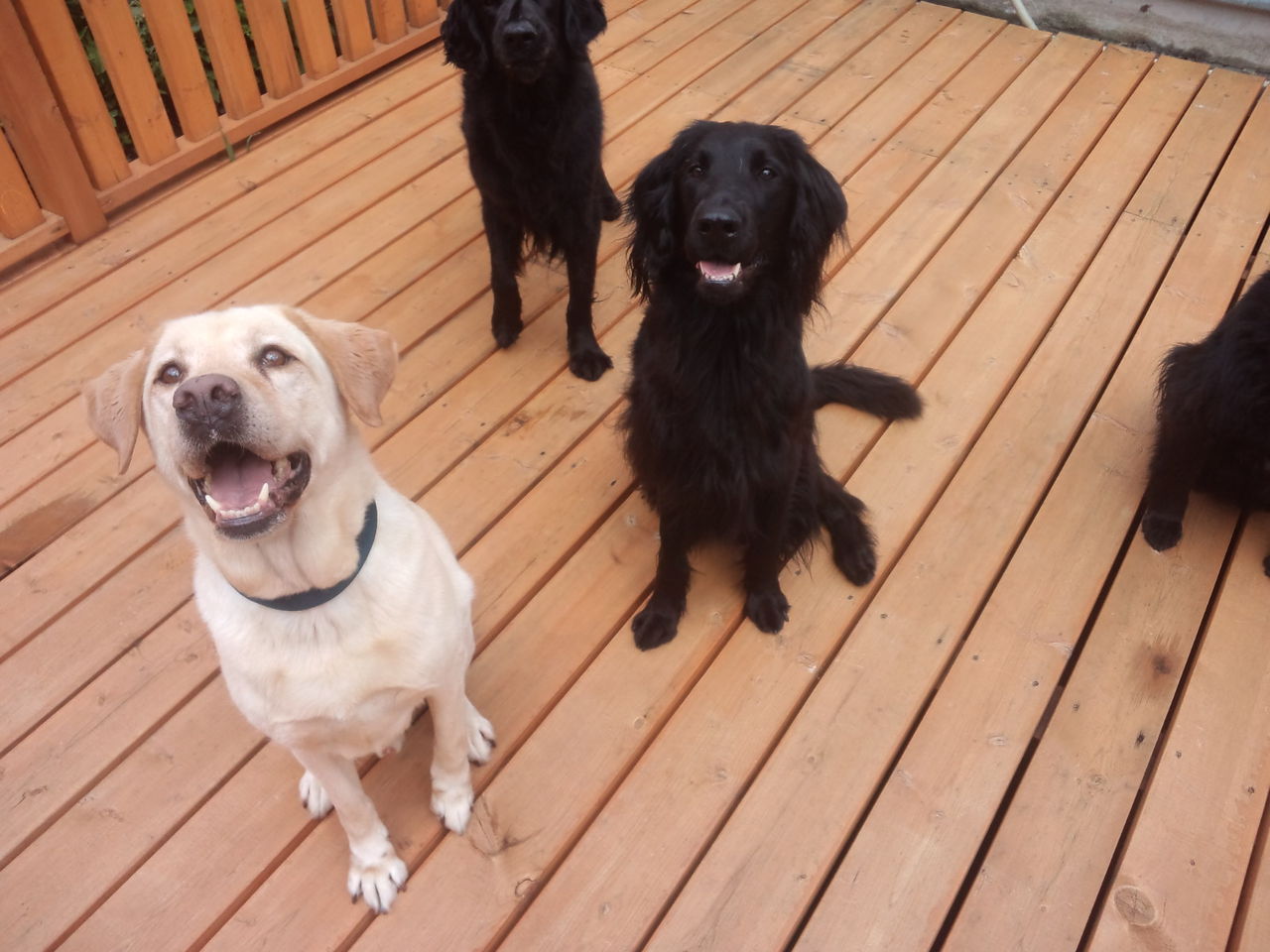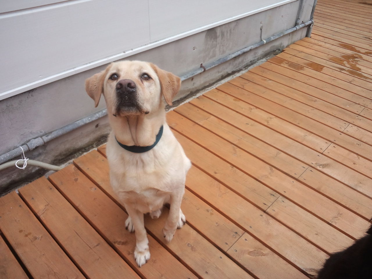 ラブラドールのパラス君がチェックインしました。フラット君達と匂いを嗅いだり嗅がれたり、ちゃんと挨拶してます。