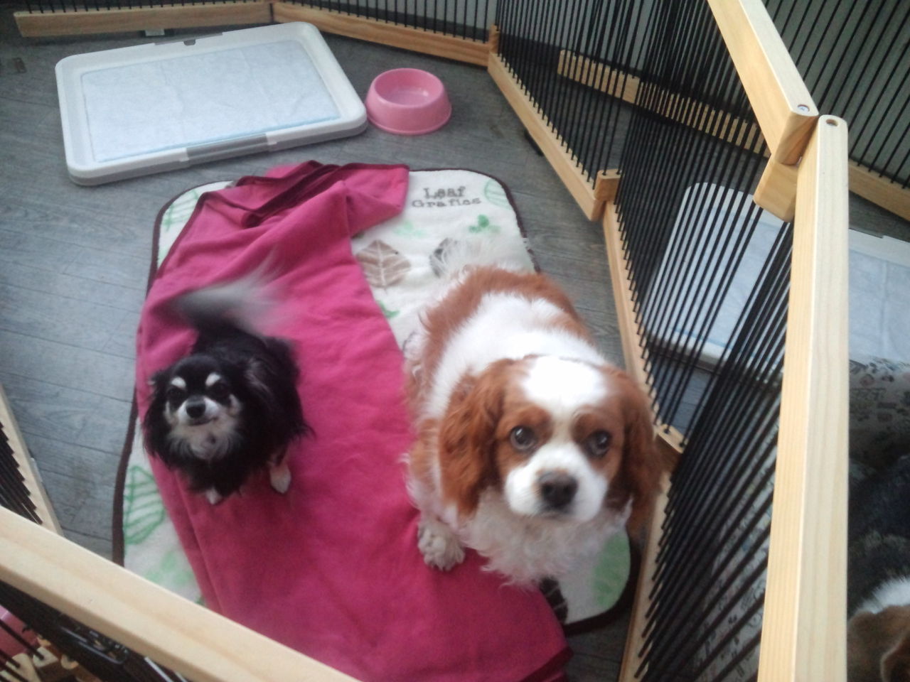キャバリアマリン君とチワワコロンちゃんがチェックインしました。チワワコロンちゃんは店長に甘えてくれますが、キャバリアマリン君はまだ飼い主さんと離れたのがショックかな?