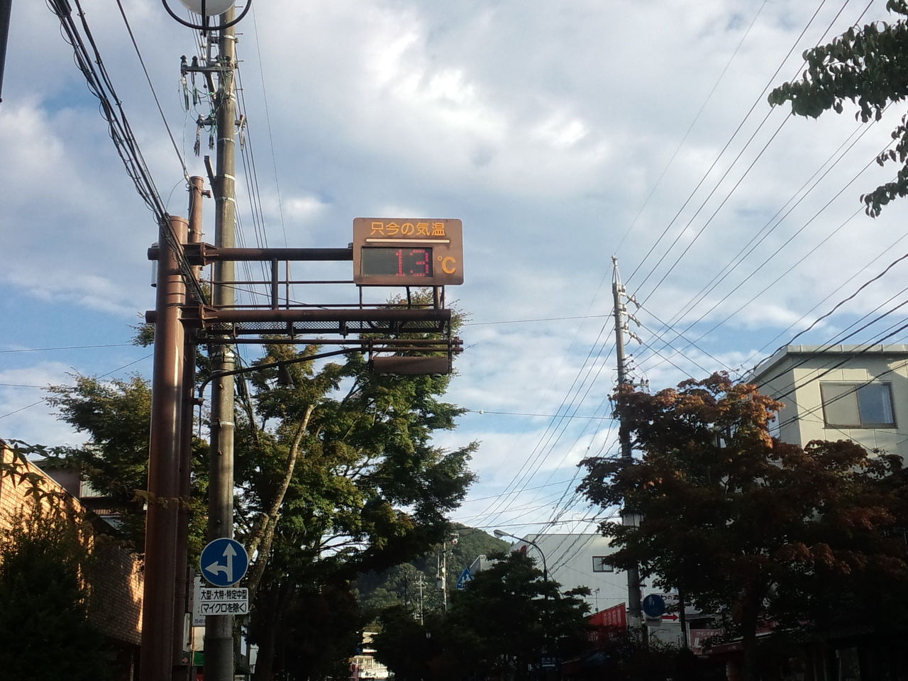 今朝の軽井沢の気温は13℃、天気は晴れてます。