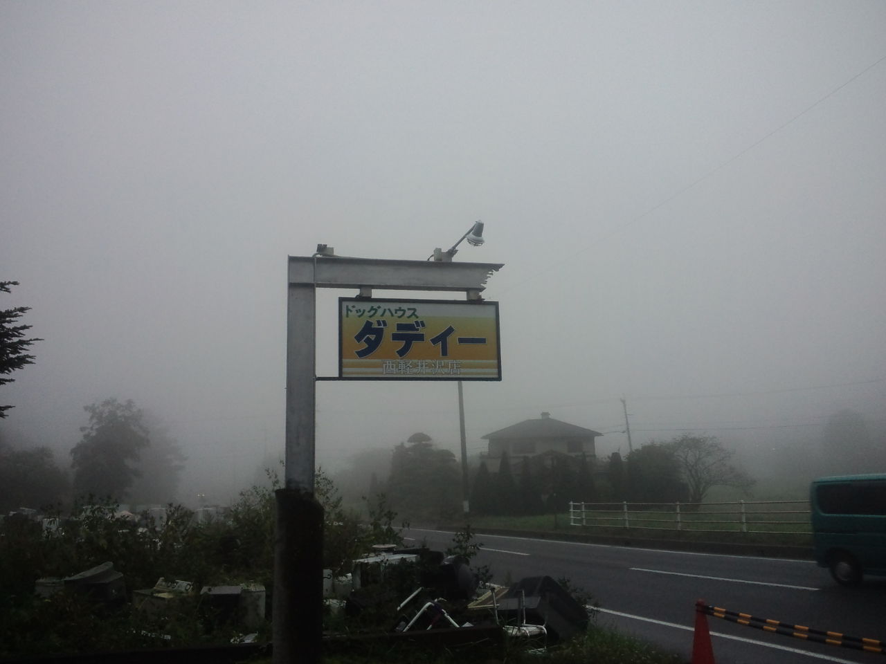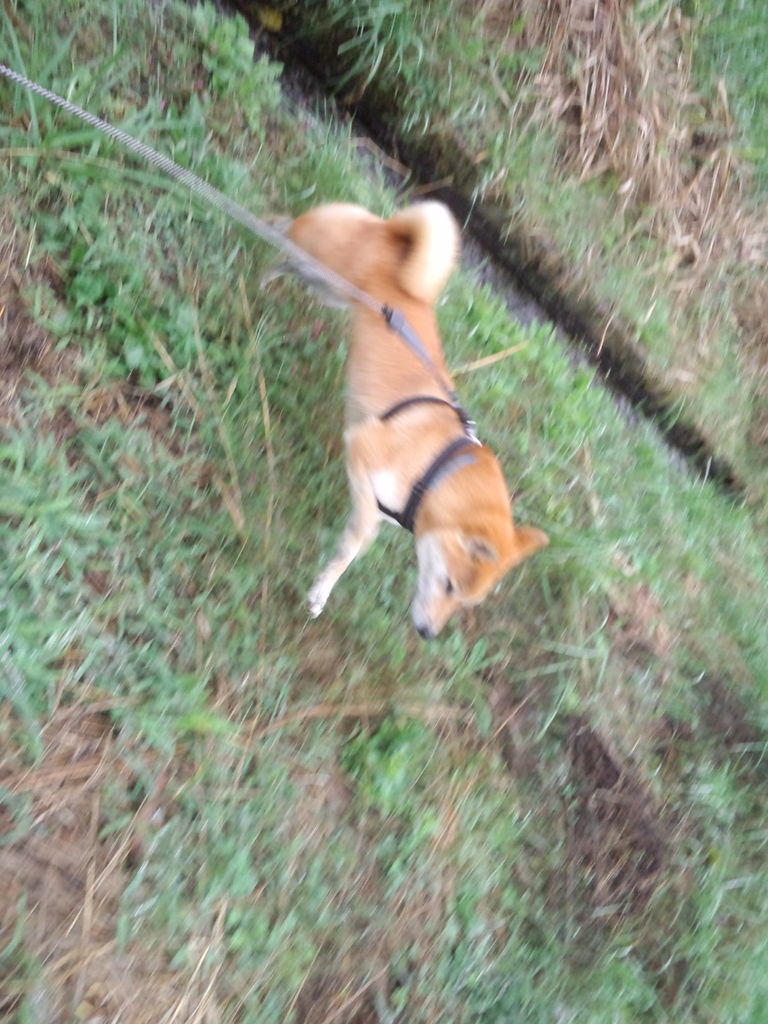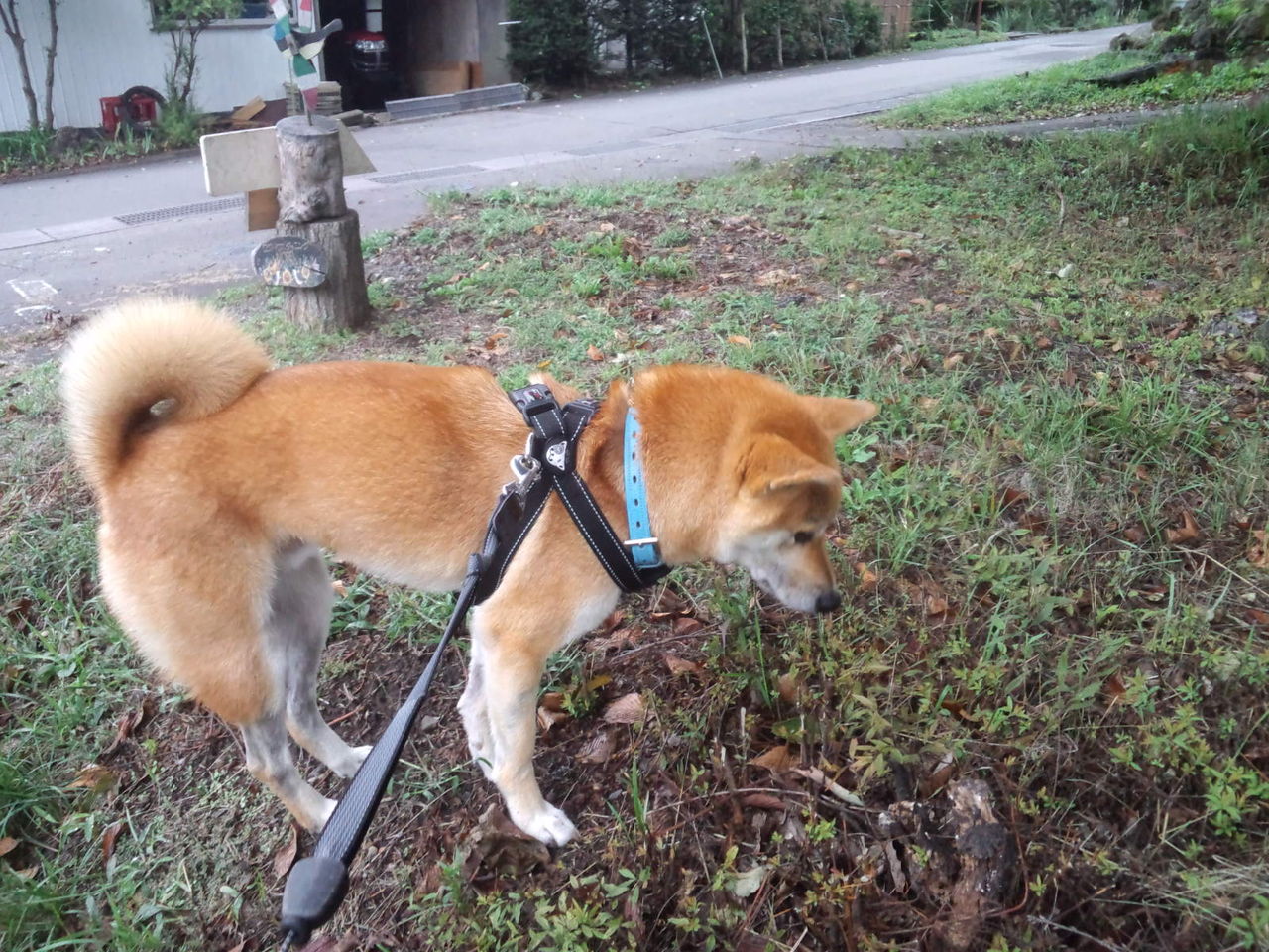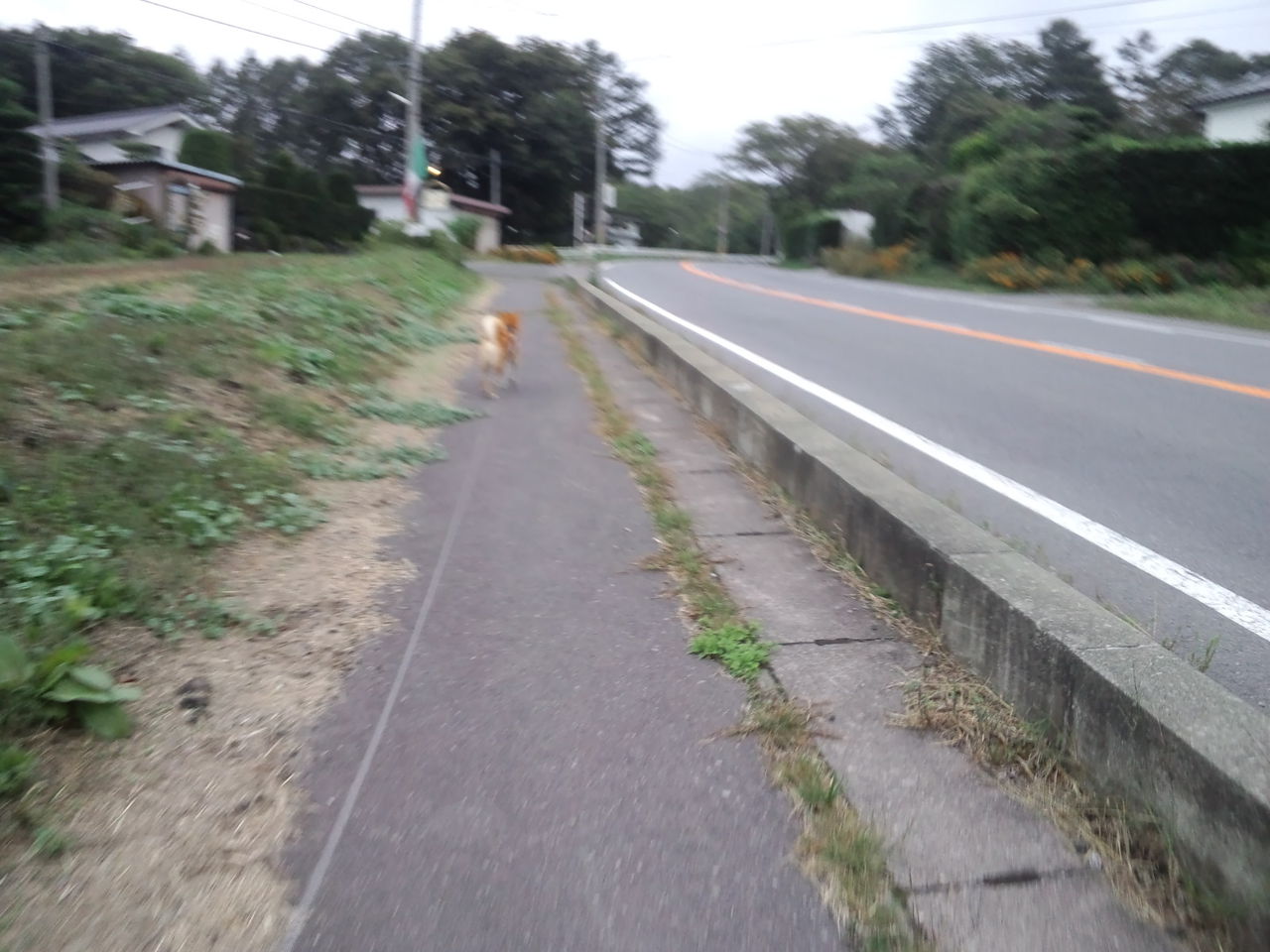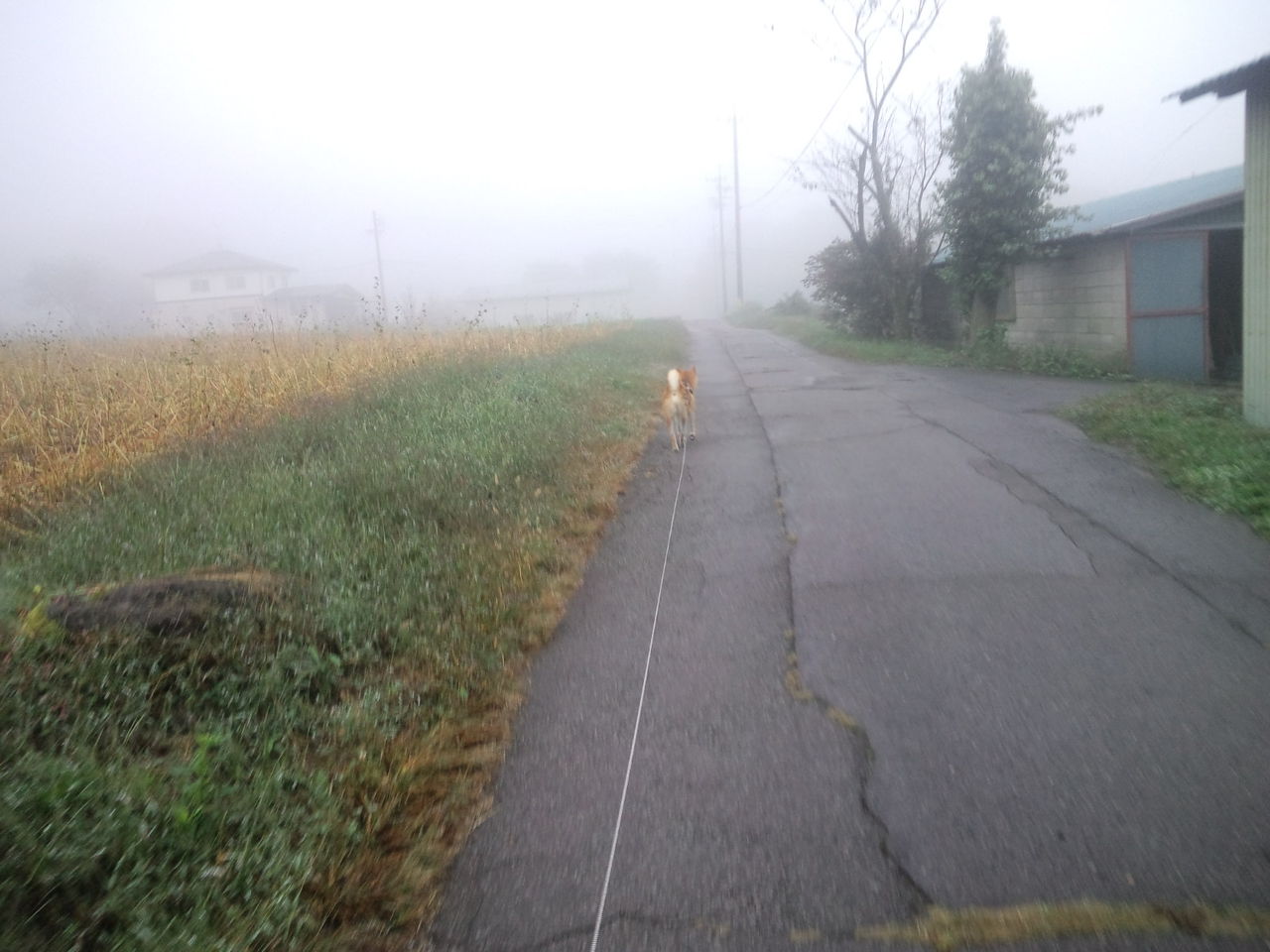 霧雨も上がり曇り空の軽井沢です。ハチ君も元気に歩いてます。