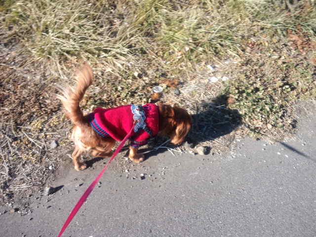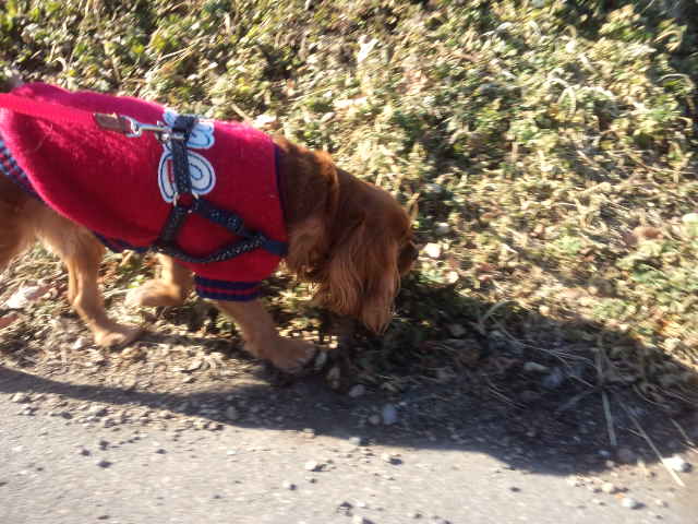 キャバリアルビー君はオプション散歩してきました。 グイグイと引っ張って歩くルビー君、お散歩大好きですね。 リードを見たとたん、すっかり『お散歩モード』になってました。