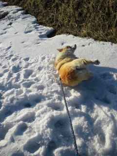 今日は晴れていたので、ニコルくんがいつもゴロゴロする所の雪がほとんど消えてしまったので新たな場所でゴロゴロしました!