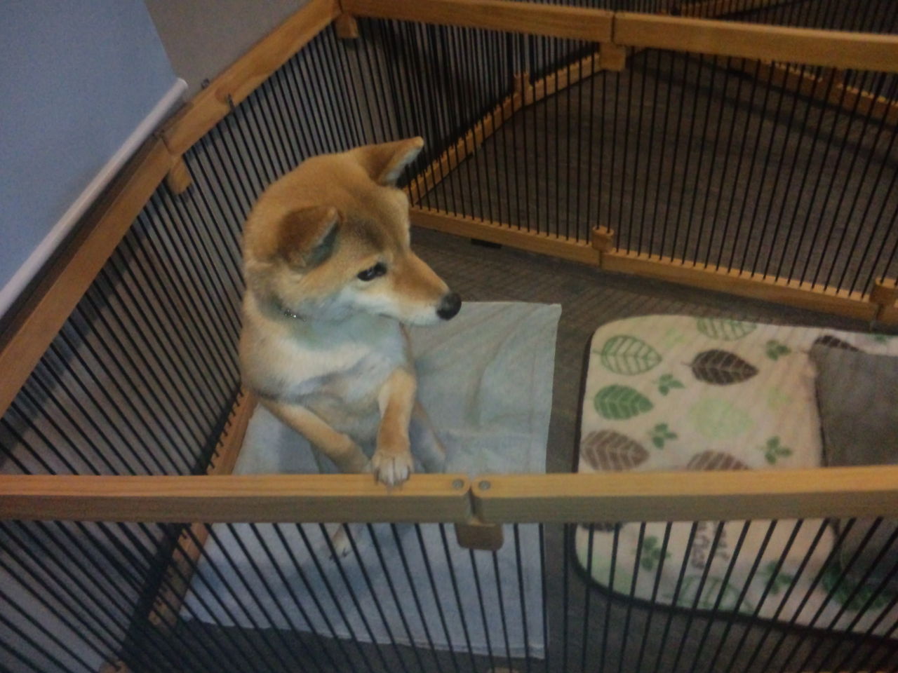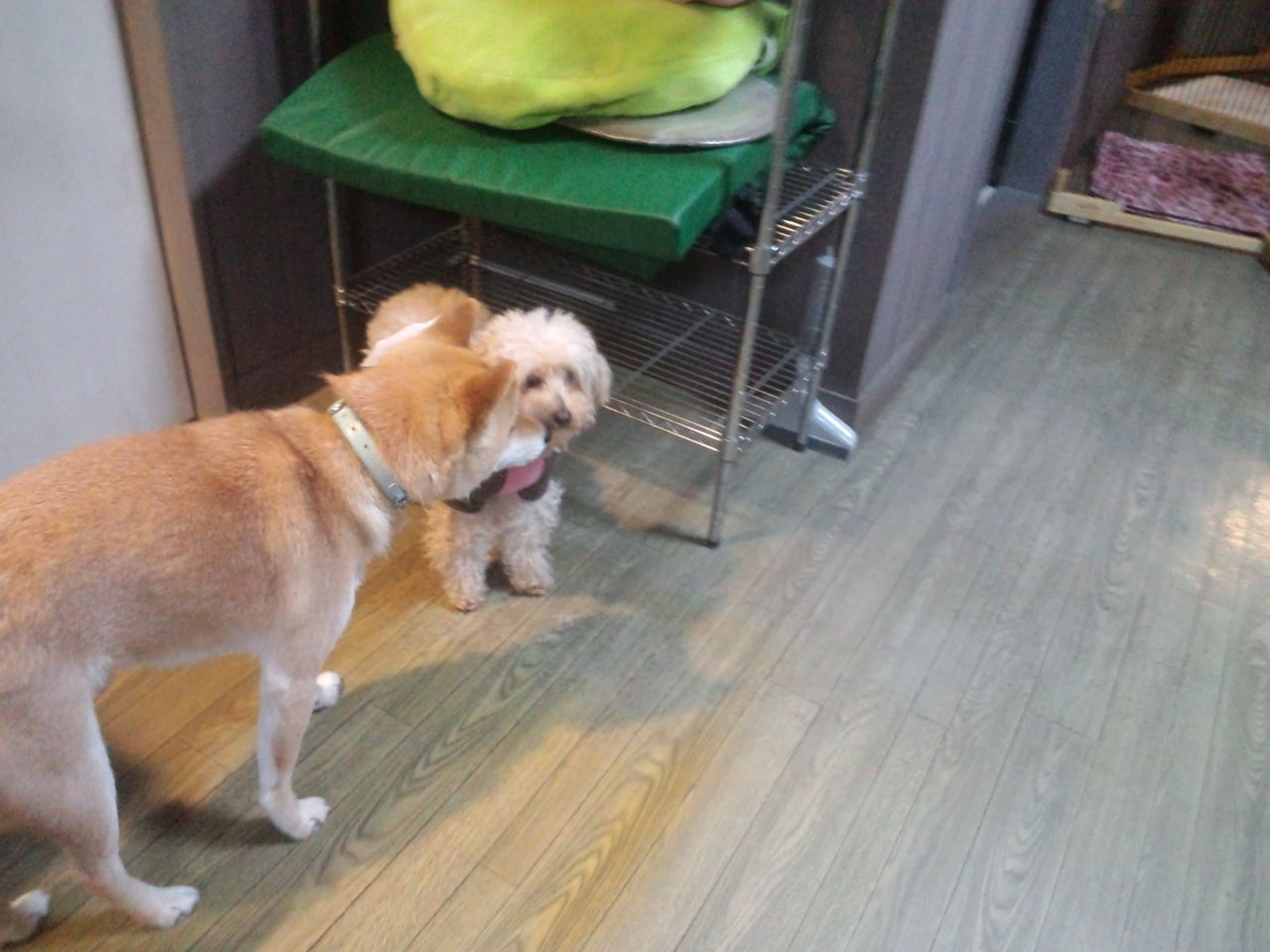 最初は少しヒュンヒュン言ってましたが、サークルから出したら他のワンコ達にもご挨拶してます。