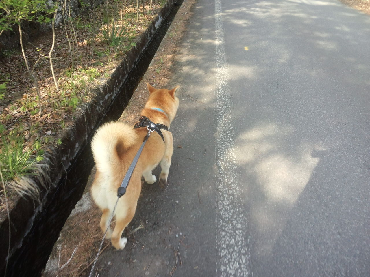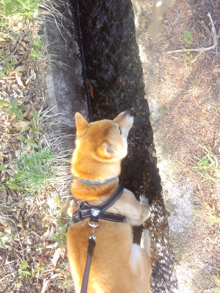日差しの中のお散歩です。 ハチ君、久々にバシャバシャしてました。