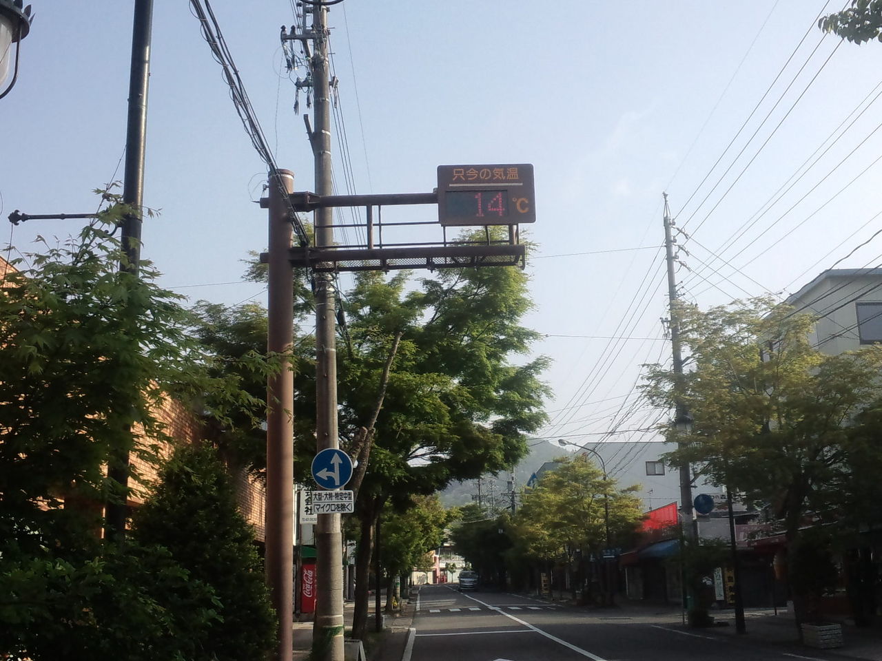 今朝の軽井沢の気温は14℃、天気は晴れてます。