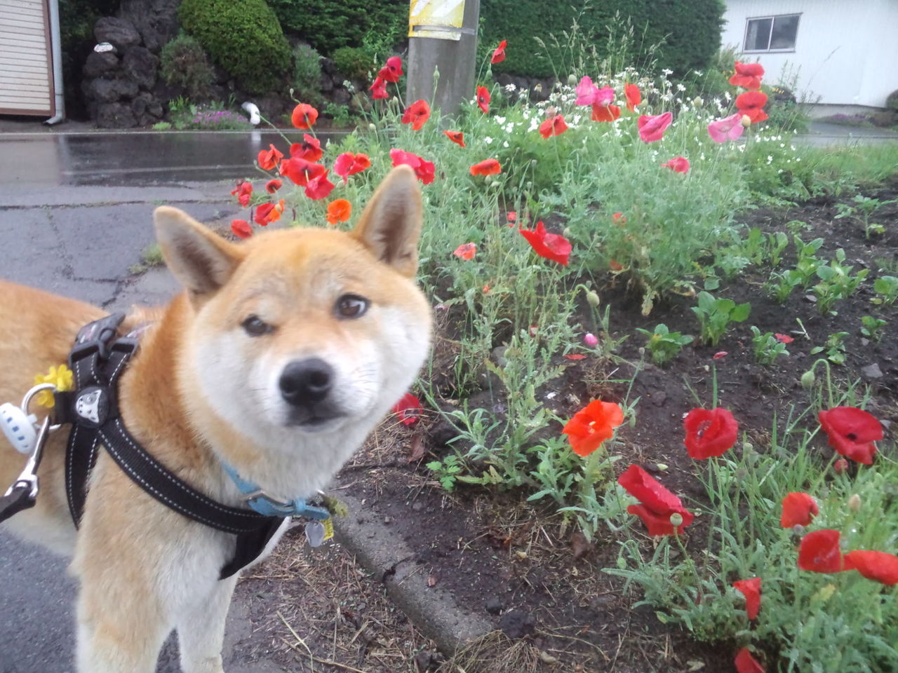 途中で芥子の花かな?綺麗ですが匂いがキツいかな?ハチ君は変な顔してます。