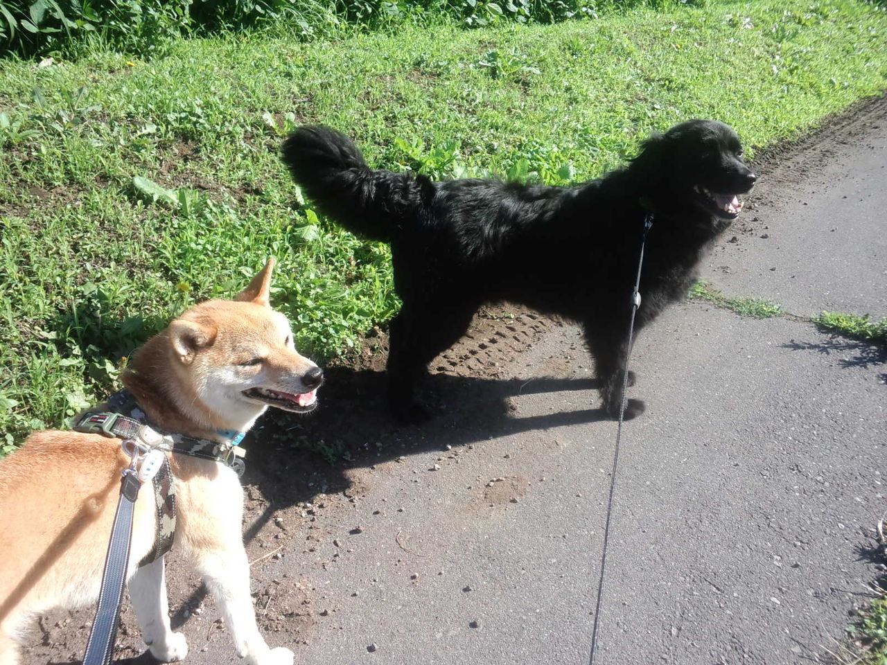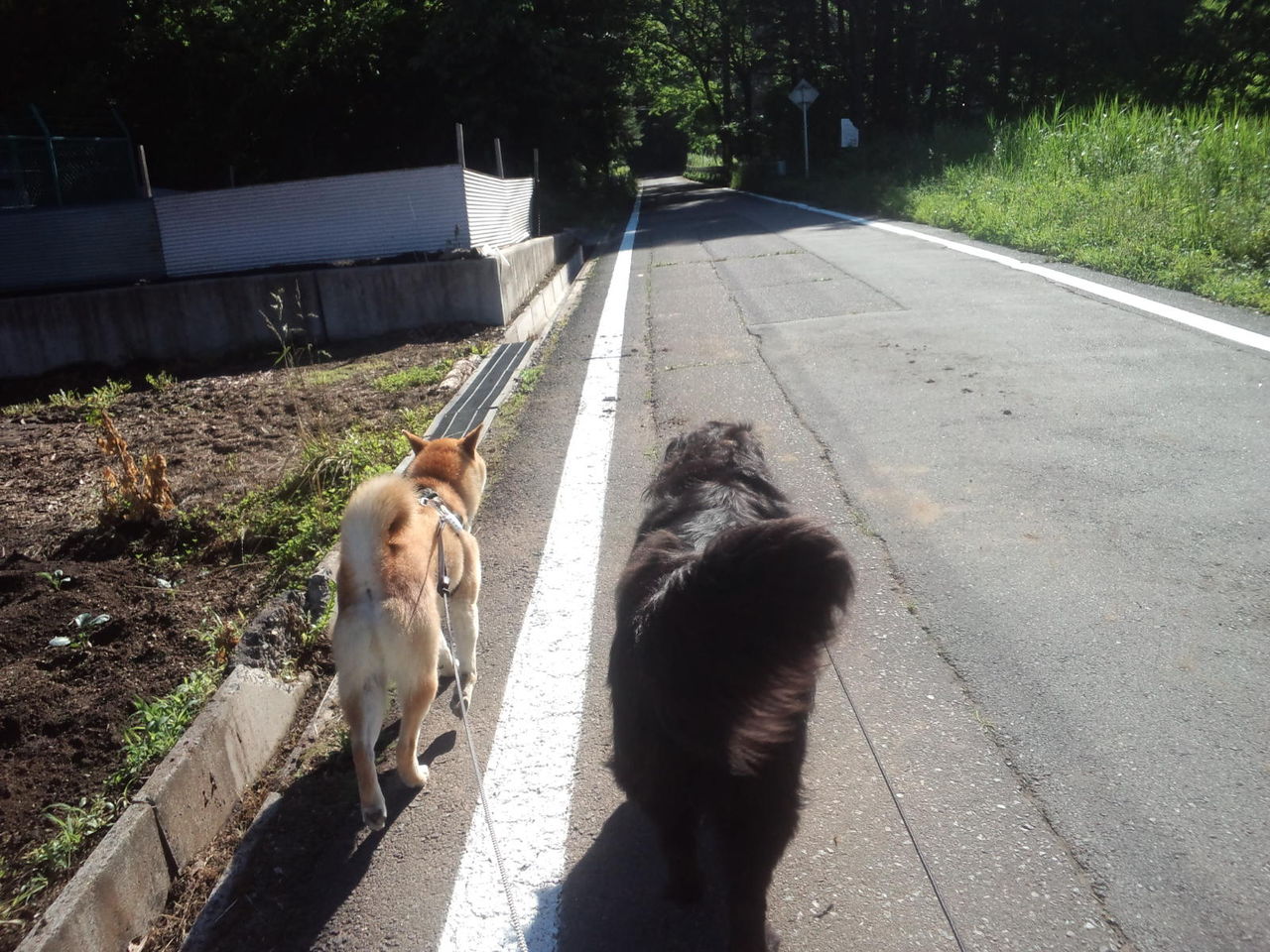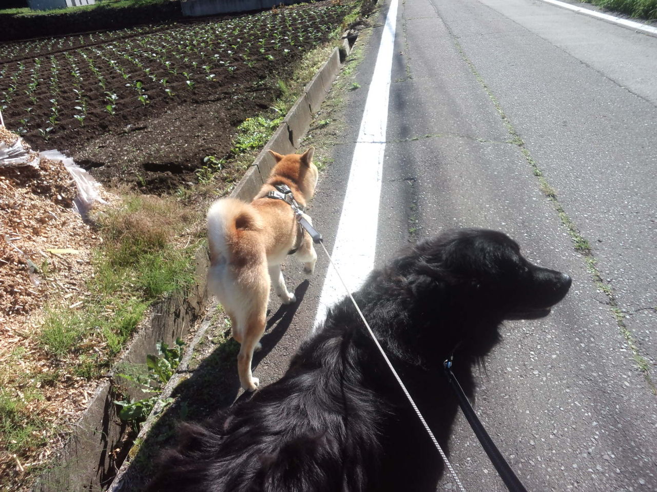 今朝は既に暑いです~。早めに切り上げなきゃハチはバテるかな? と思いきや、大治郎と一緒にお散歩で喜んで歩いてます。