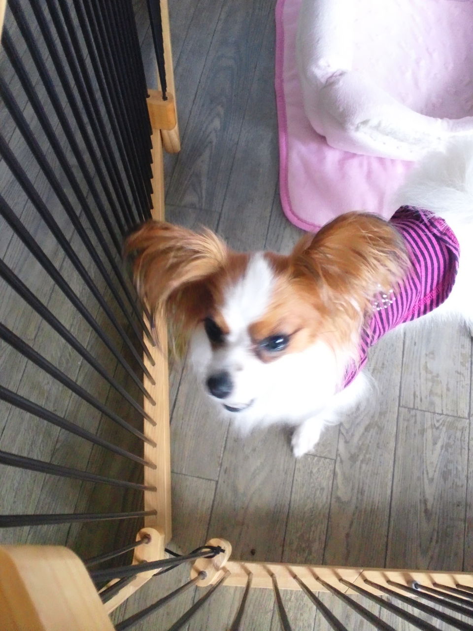 すぐにサークルから出てきましたが、緊張しているようで少し離れた距離から見ています。