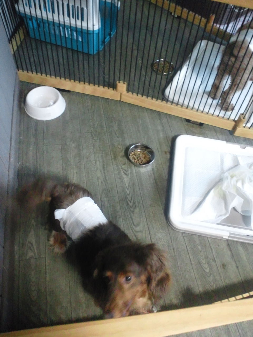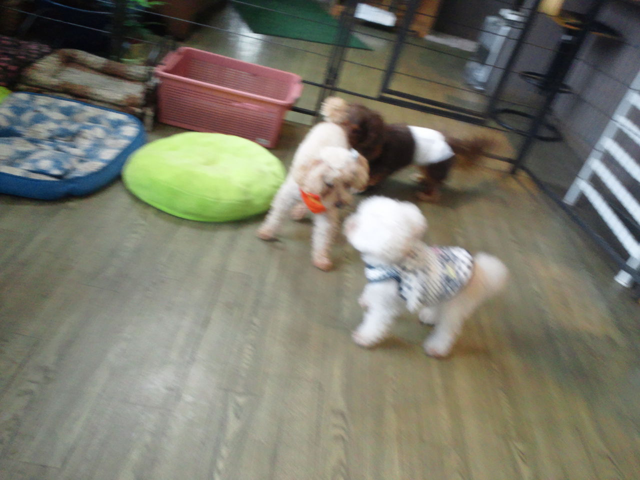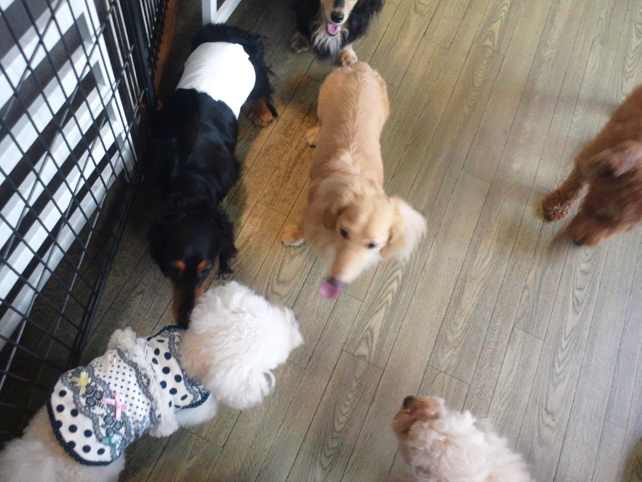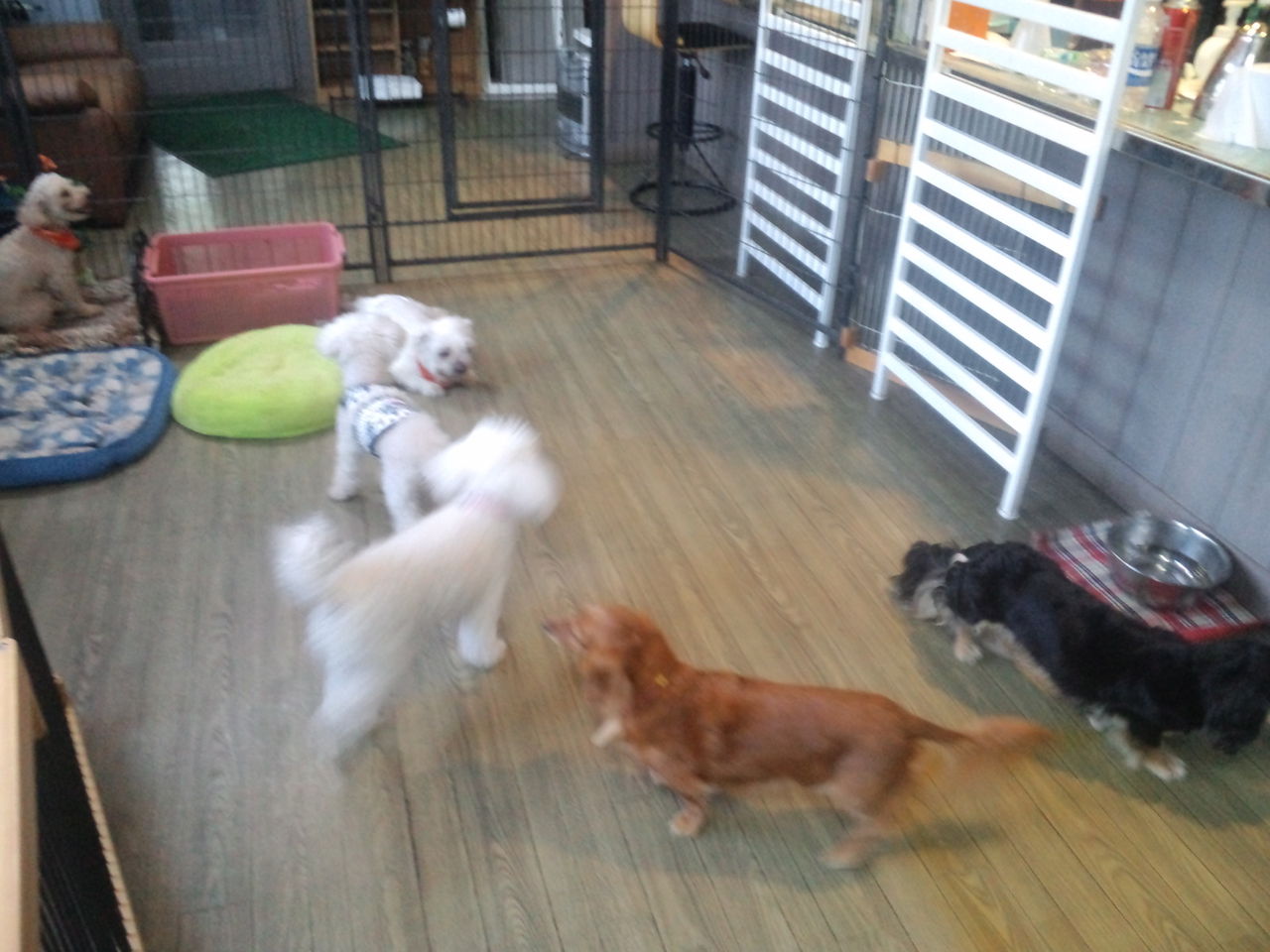 ちょっとわんちゃんが苦手そうな感じですが、すぐにサークルから出てみんなと一緒にいます。