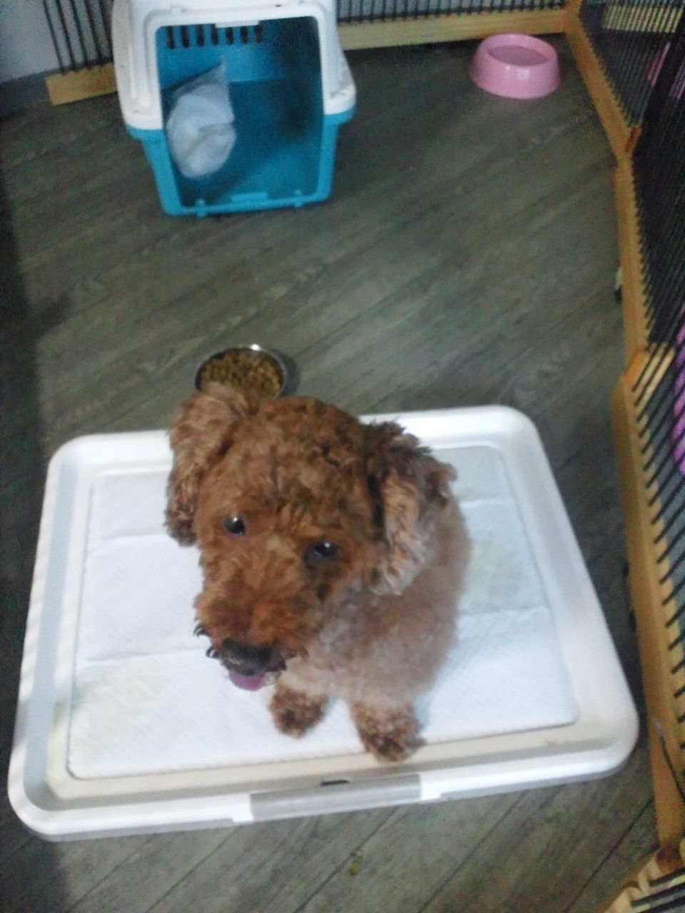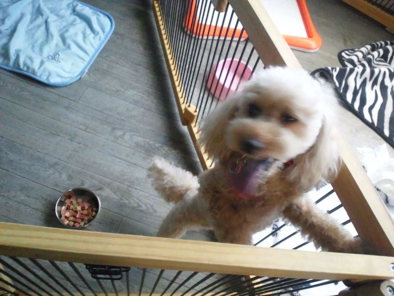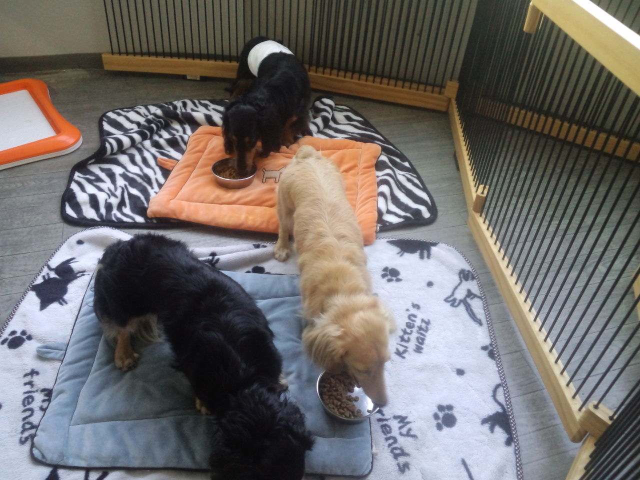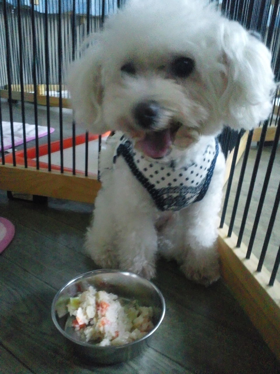 ちょっとわんちゃんが苦手そうな感じですが、すぐにサークルから出てみんなと一緒にいます。