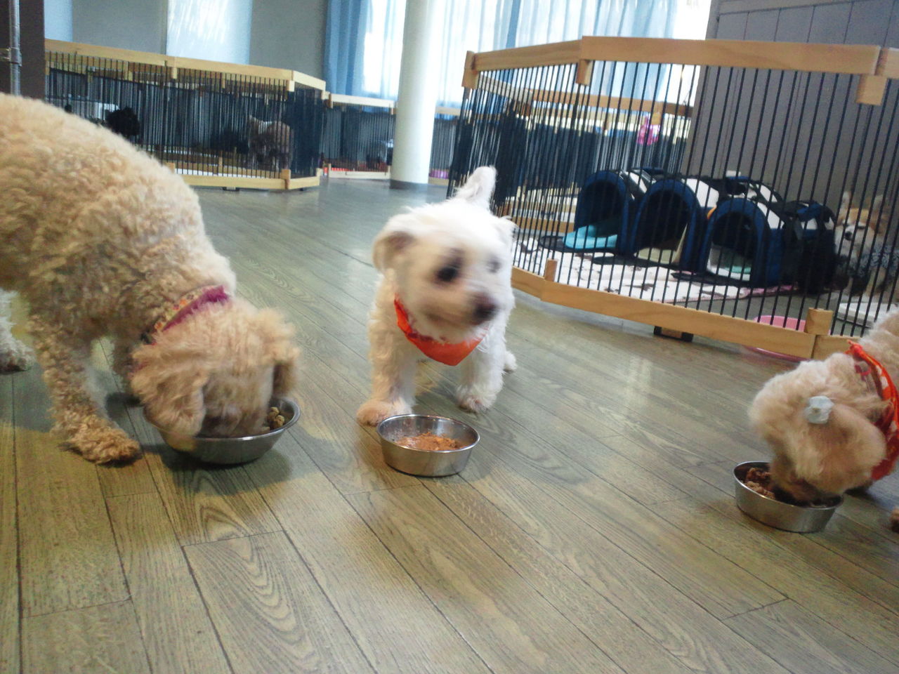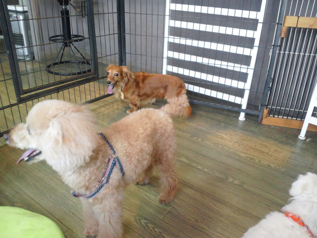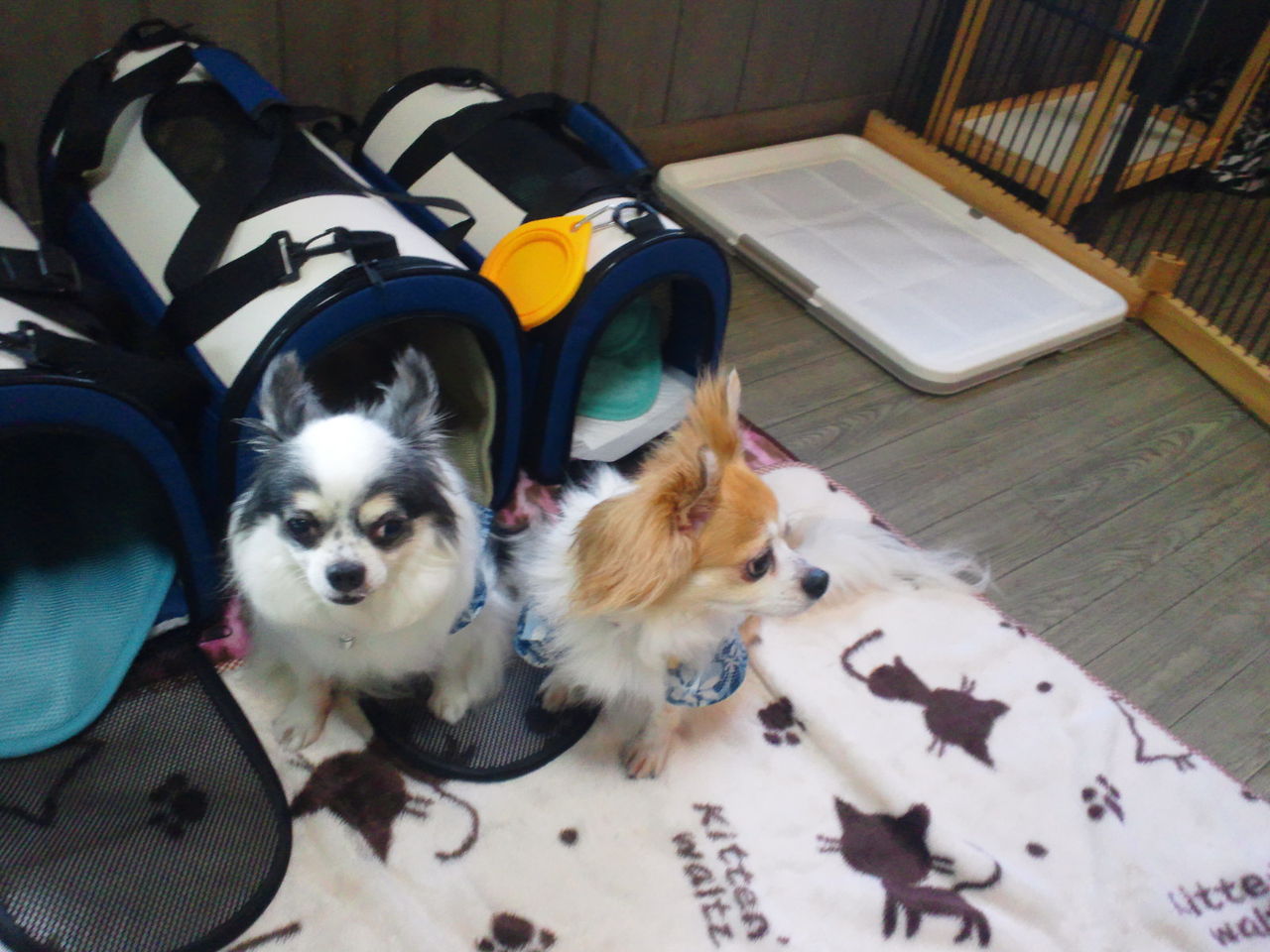 キングくん、ぽんずくんはサークルの中で周りの様子を伺っています。 ココアちゃんはクレートにいます。