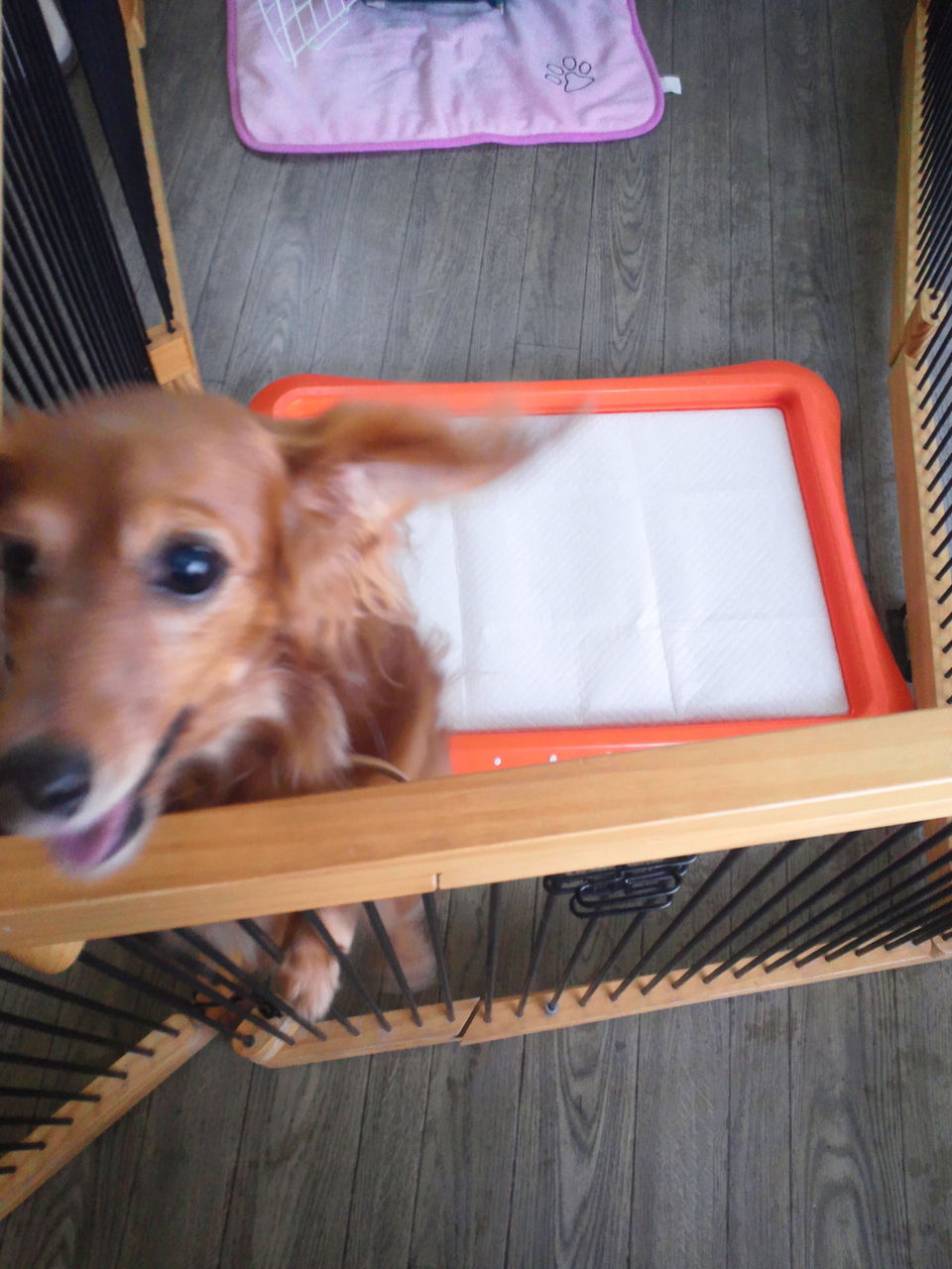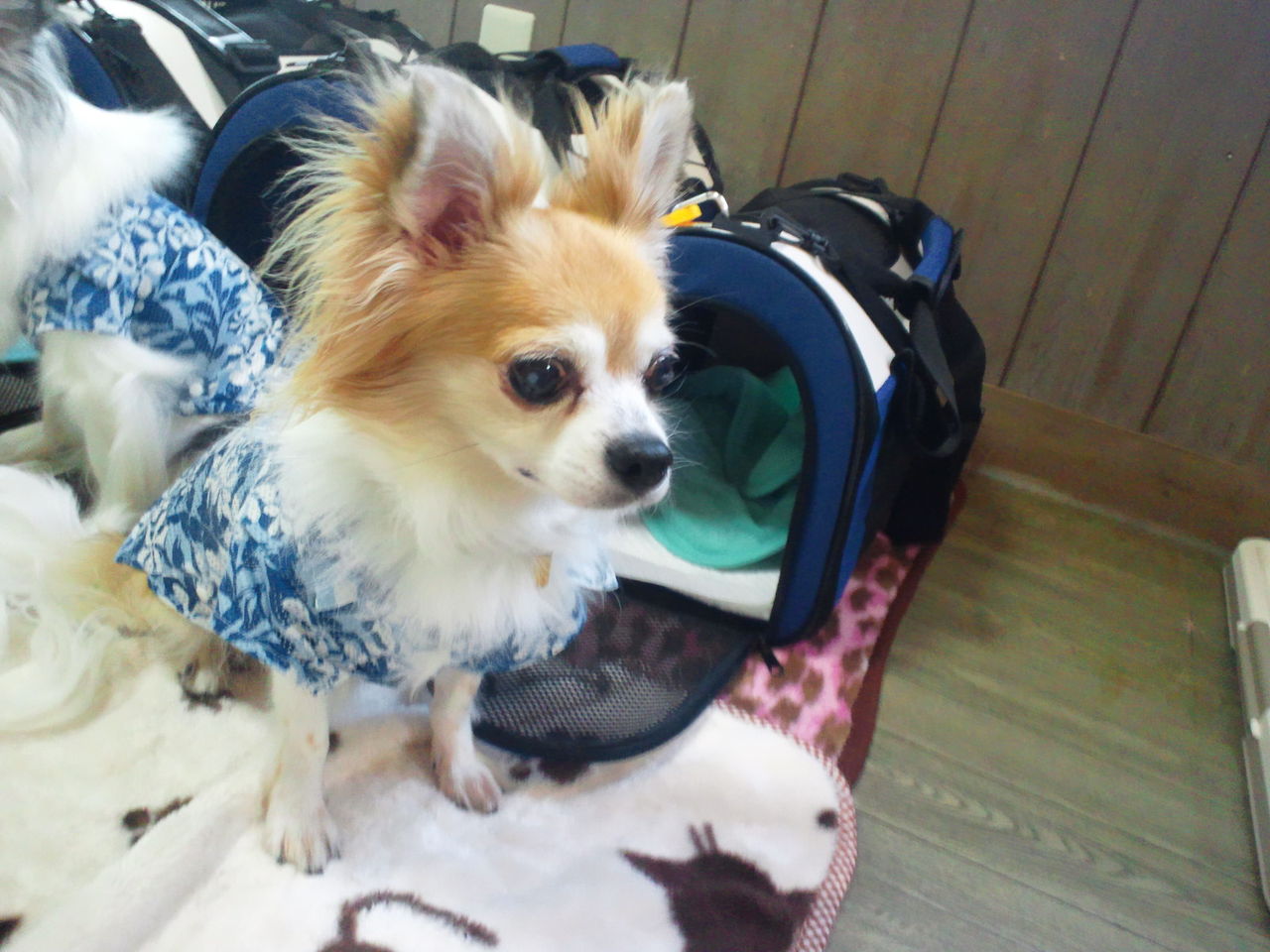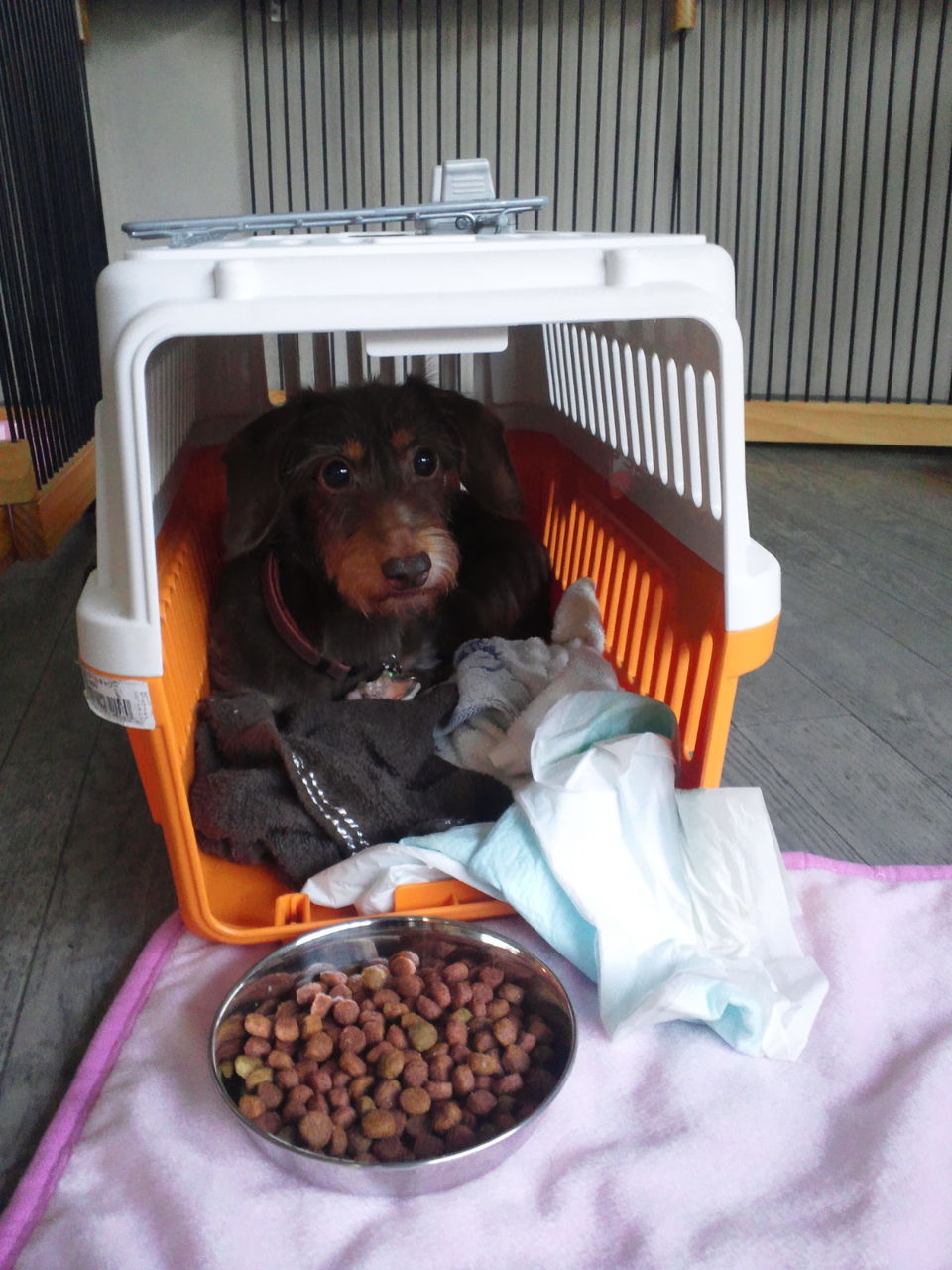 キングくん、ぽんずくんはサークルの中で周りの様子を伺っています。 ココアちゃんはクレートにいます。