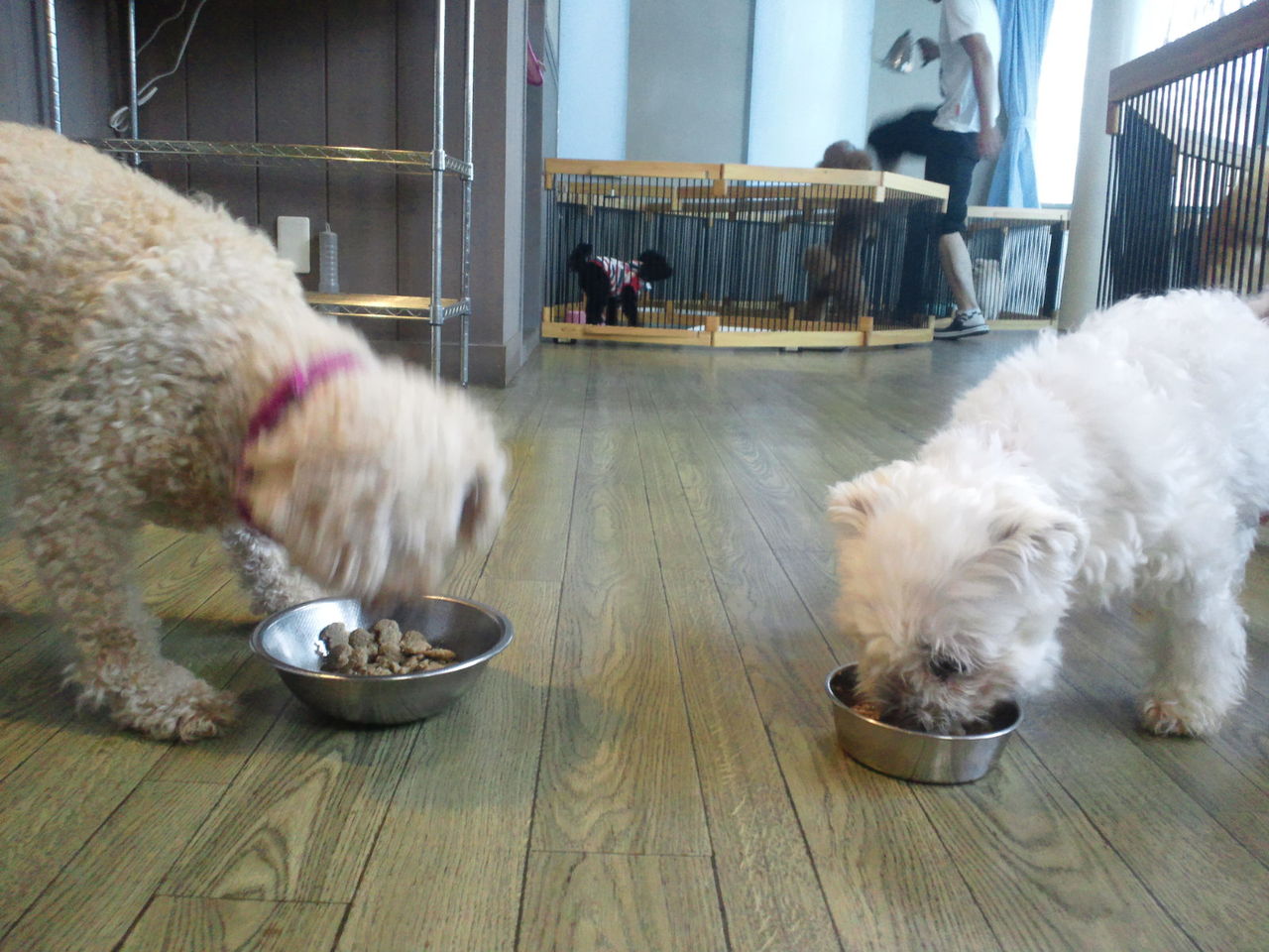 恐る恐るサークルから出てきて、他のワンコともつかず離れずで仲良くって感じです。
