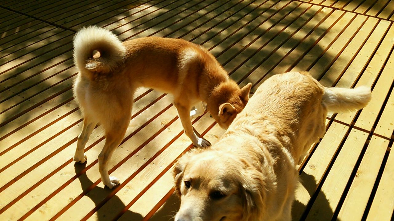 お散歩に出たら、チェックインのゴールデンマロンちゃんが来ていました。 マロンちゃんの飼い主さんはあられちゃんの事を知っていました。前に一緒になったかな? マロンちゃんが気になって振り返り振り返りしていました。