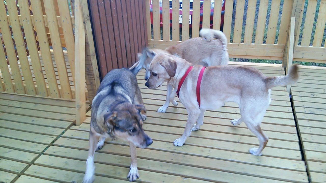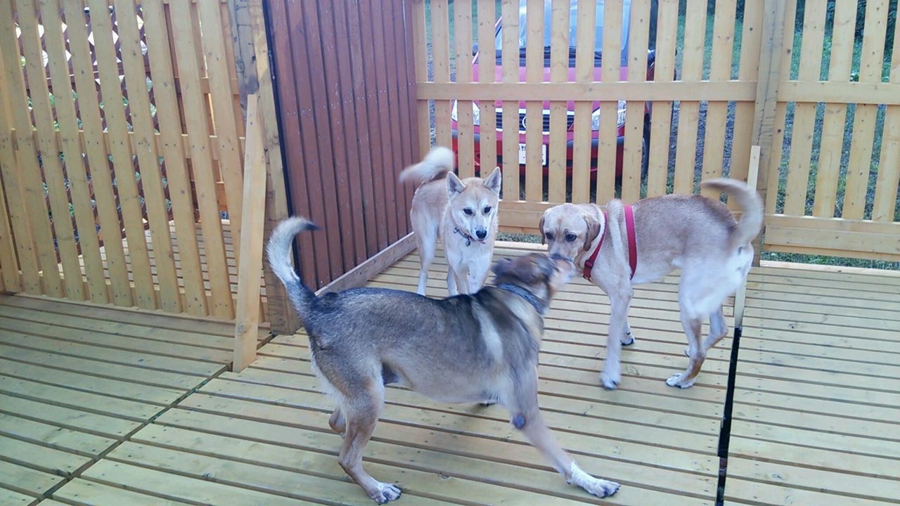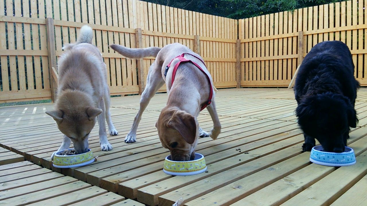 ミックスアキくん、ラブラドールみかんちゃんとすぐに仲良くなって3匹でドタバタ遊んでいます♪ 遊ぶのに忙しく、寂しがっている暇がないみたいです!