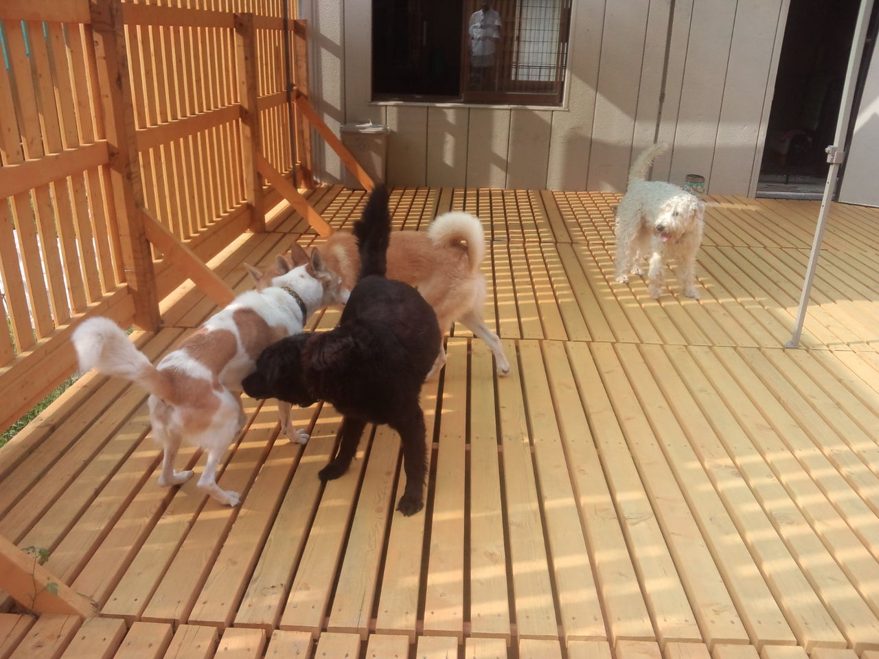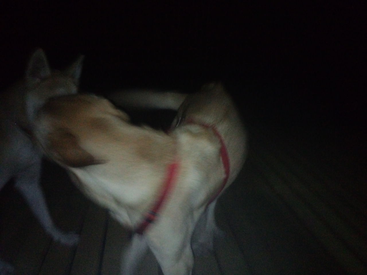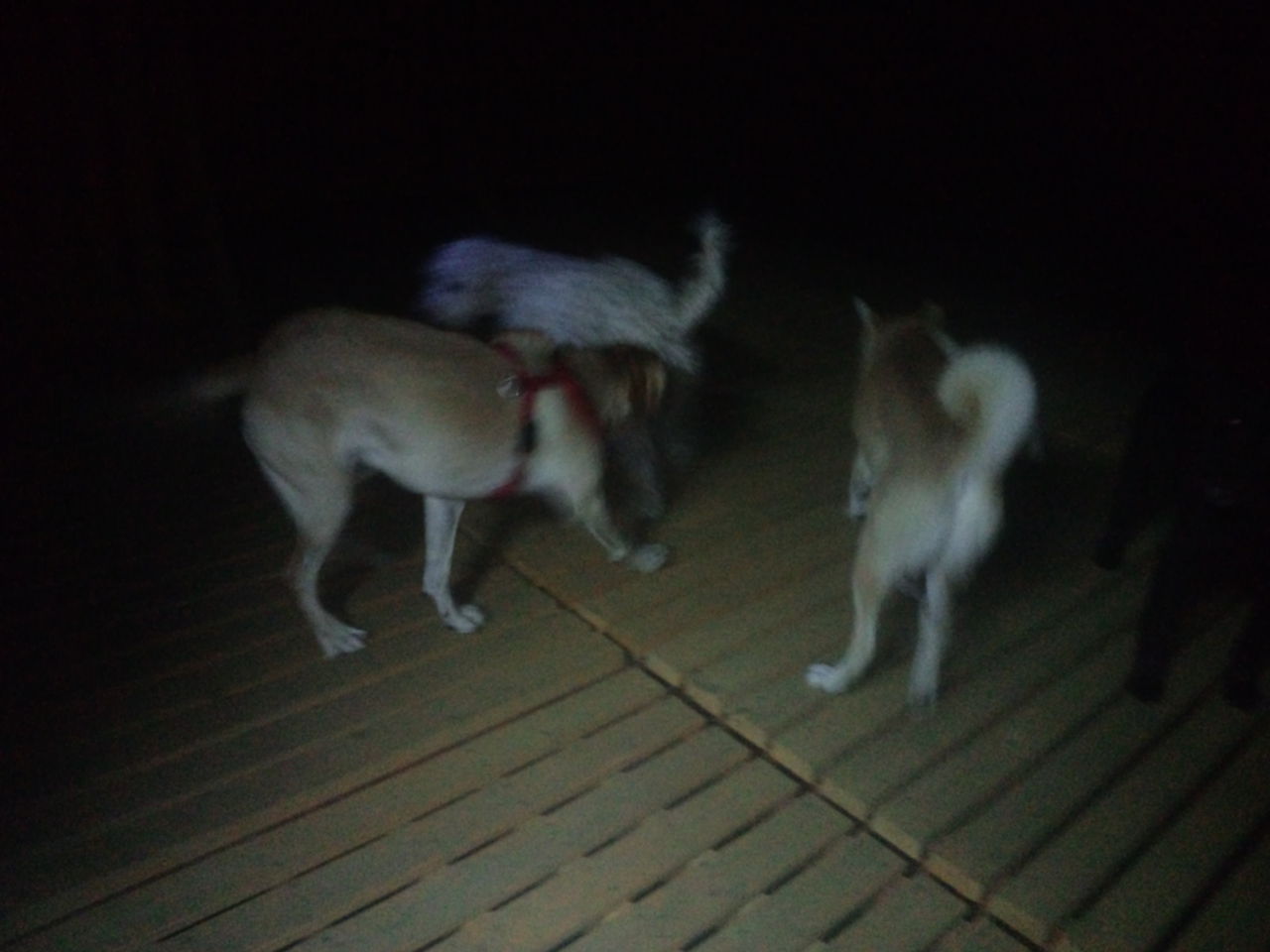 すぐにミックスアキ君と仲良くなり、暗闇のデッキで遊びまわってます。