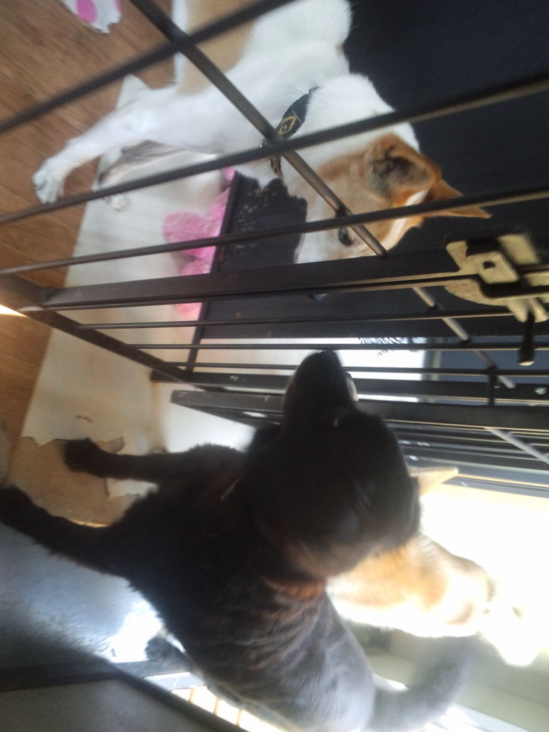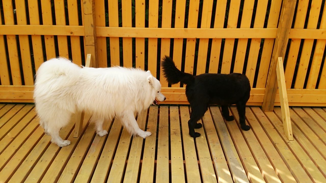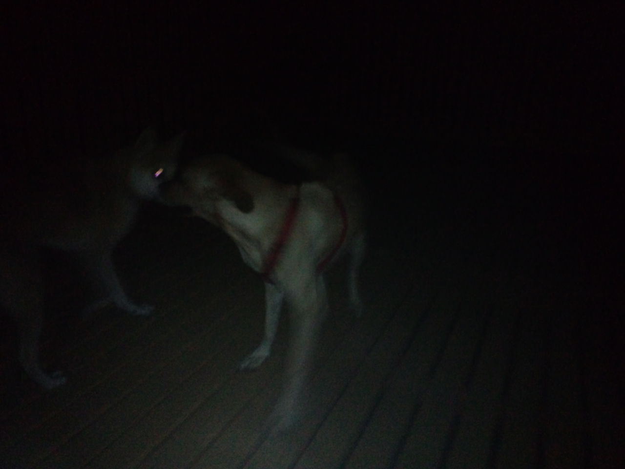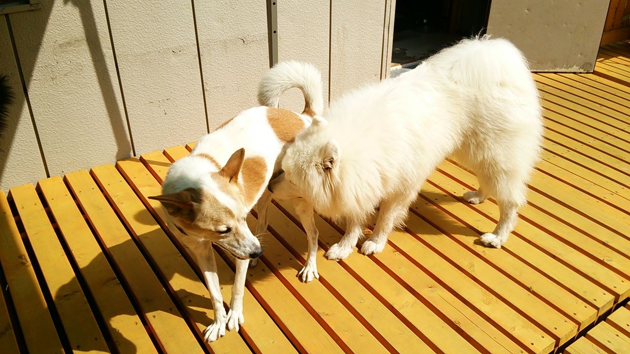 すぐにミックスアキ君と仲良くなり、暗闇のデッキで遊びまわってます。