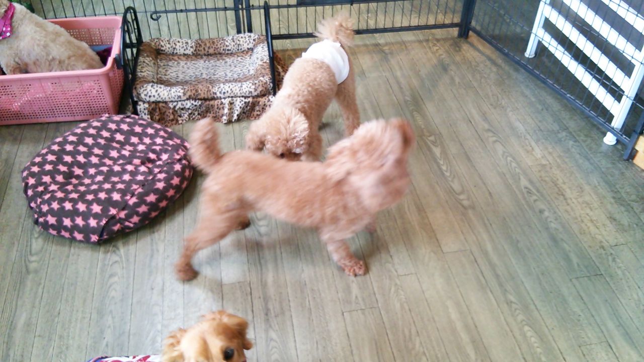 今日の大型エリアは賑やかです。 てんきゅうくんと仲良しのラブラドールみかんちゃんや1才のミックスアキくんなど元気いっぱい遊びたいちゃんがいるので飛び回って遊んでいます♪