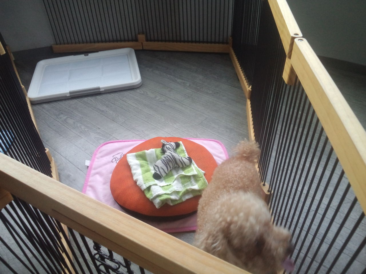 他のワンコや人間とは?なオプちゃん、始めははサークルから出せ出せで大騒ぎでした。扉を開けたら開けたで他のワンコ達が苦手な様子で固まってしまいます。