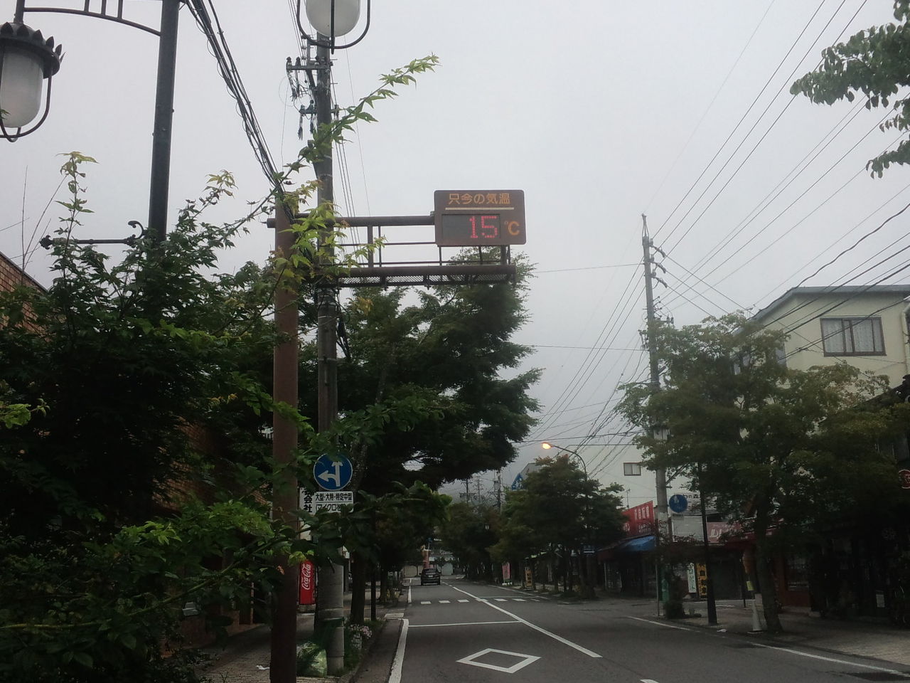 今朝の軽井沢の気温は15℃、天気は霧雨です。