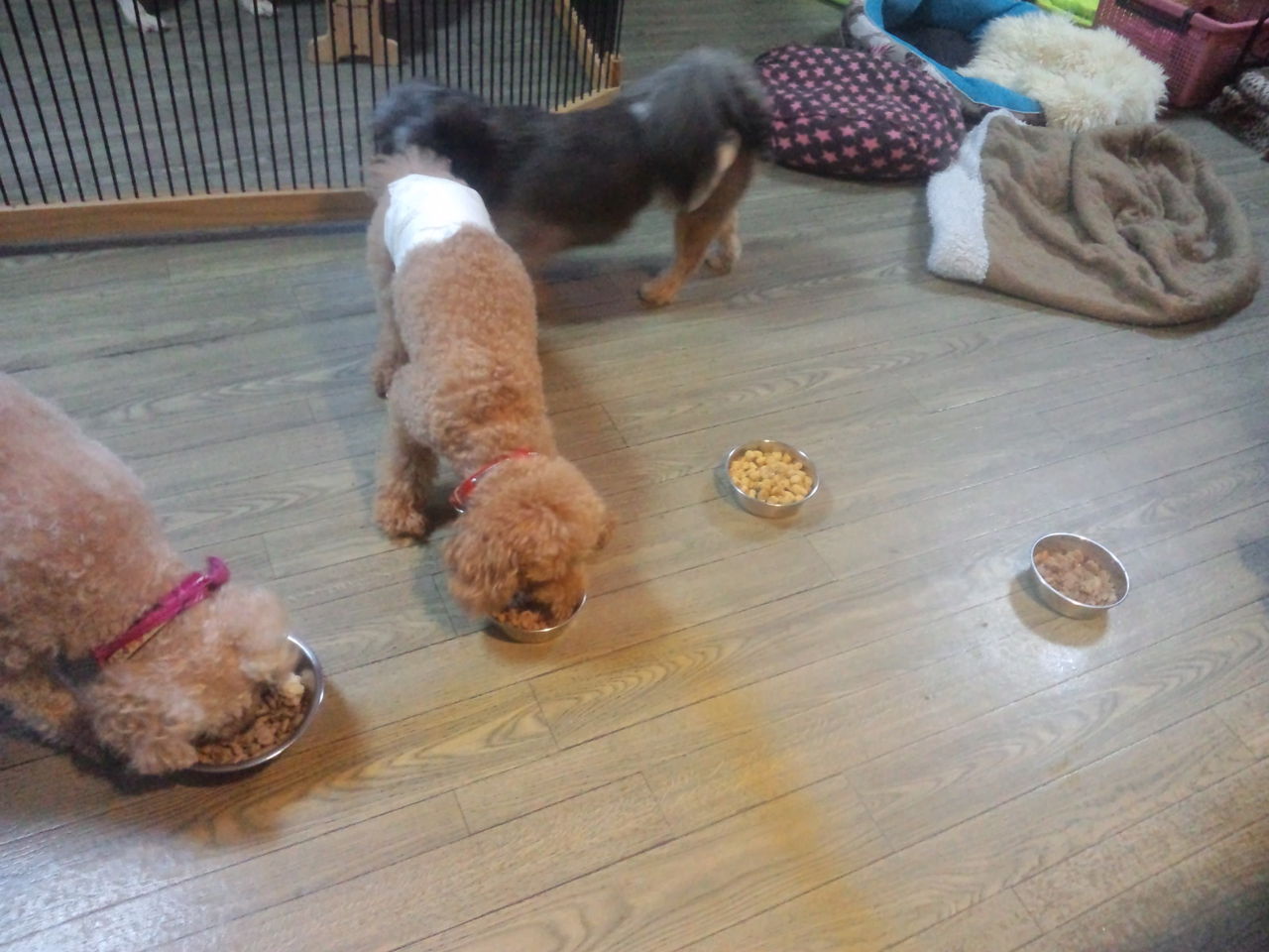 生涯預かりトイプーテディ君、しっかり完食しました。ベラちゃん、口をつけません。