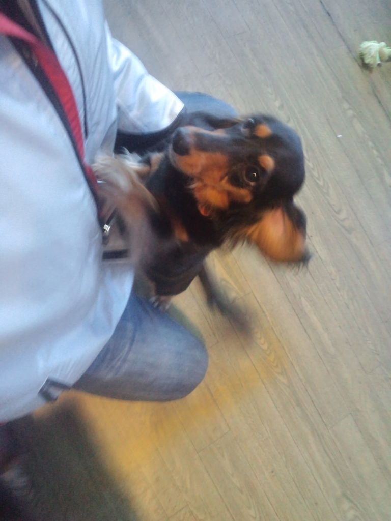 最初は緊張してたかな?でも飼い主さんが居なくなるとすぐにサークルから出て、店内を匂いチェックして、その後は店長に激しく抱っこをせがんで来てます。