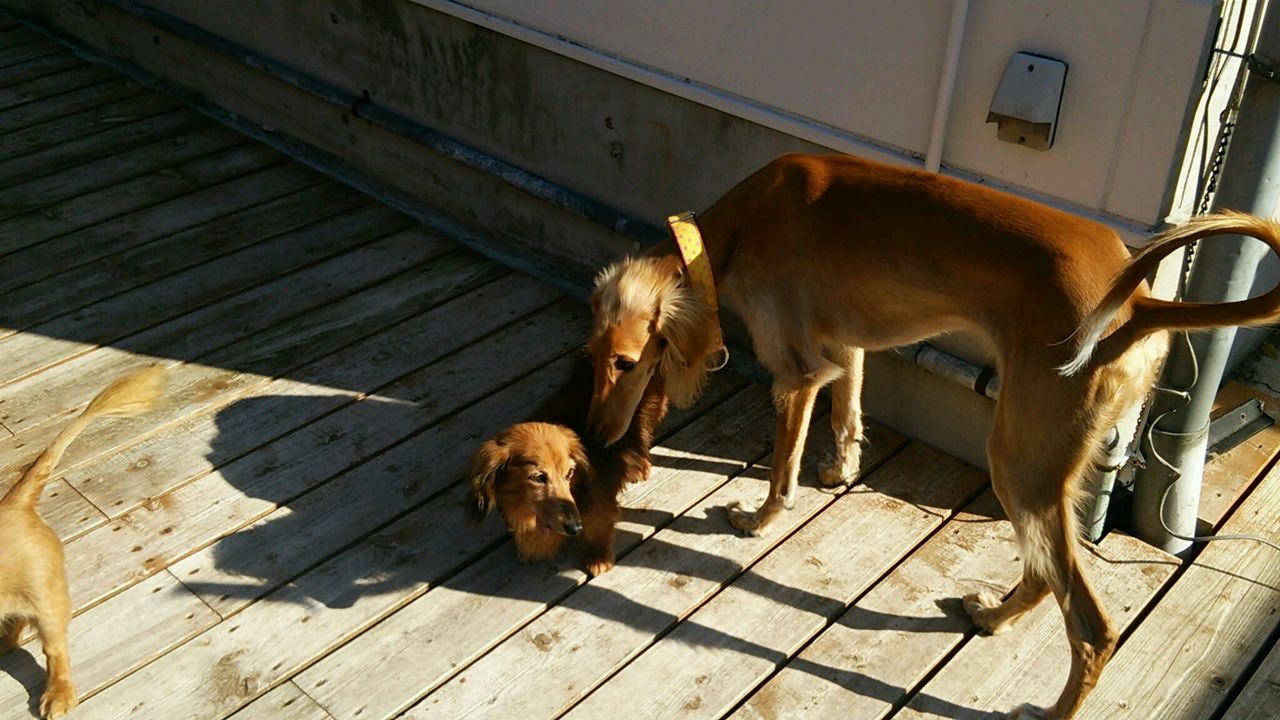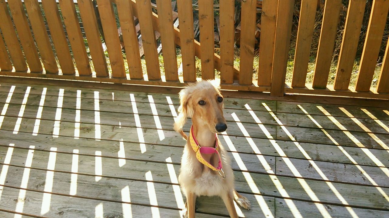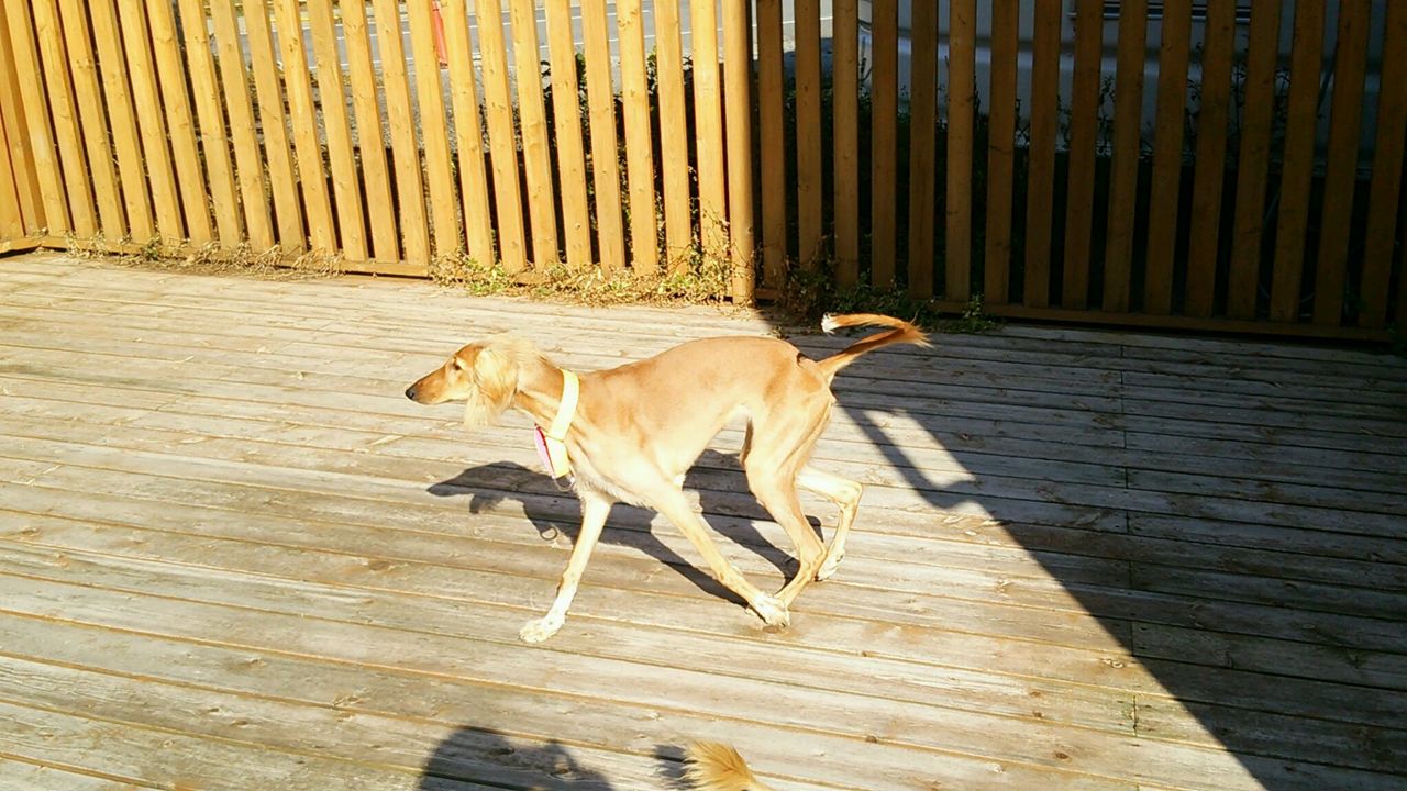 常連のサルーキメルローちゃんがまた来てくれました♪ 晴れてるおかげなのかデッキで飛び跳ねています! いつもよりテンション高い気がします!!