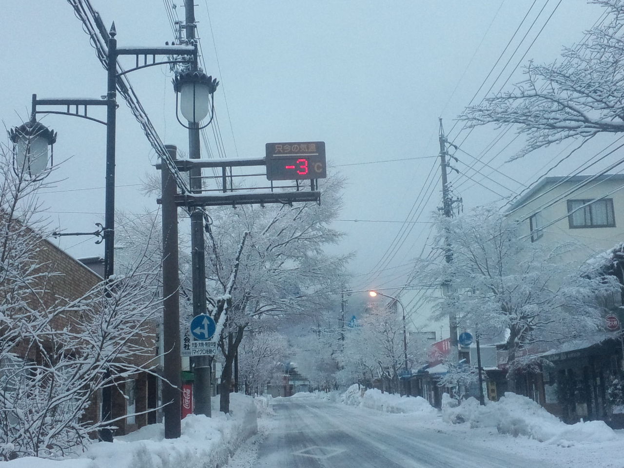 今朝の軽井沢の気温はマイナス3℃、天気は曇り空です。雪も止んで積雪はうっすらとです。