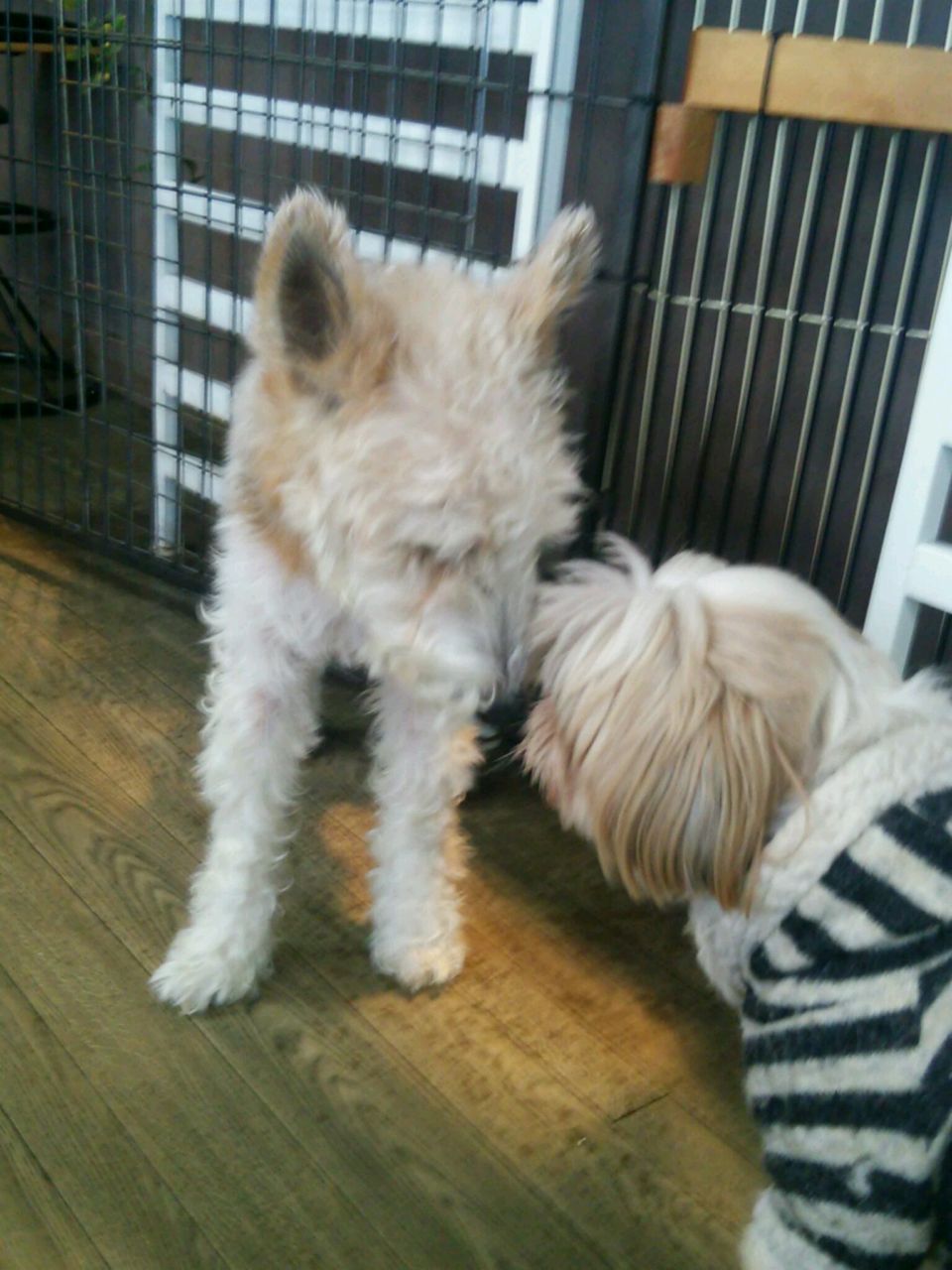 今日はたくさんのわんちゃんがいます。 女の子軍団にタジタジな様子のロビンくんです。 やっぱりお気に入りのトイプー虎治郎が良いのか遊び相手になってくれています。